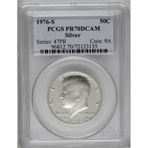 <B>1976-S<50C> Silver PR70 Deep Cameo PCGS.</B></I> An important Bicentennial issue that is difficult to obtain in this top grade. The devices show copious frost and really jump out from the mirror fields. Blast white and desirable. Population: 20 in 70, 0 finer (3/06).<BR><I>From The J. S. Hamilton Registry Set of Proof Kennedy Half Dollars.</B></I> <BR><BR><B>Important notice:</B> Heritage usually auctions material at the rate of 200-250 lots per hour. On some occasions eBay Live bid software or the Internet may not be able to keep up with the pace of the auction. We recommend placing a realistic absentee bid now as insurance to avoid disappointment. Occasionally the auctioneer may eliminate or reject an eBay Live bid, and the auctioneer may also reopen a lot after the close of the eBay live bidding (usually because we missed an audience bid), and may reject your bid even if it shows you as the winning bidder. By bidding via eBay Live, you agree that Heritage may award the lot to another bidder at its sole discretion under the circumstances described above or any other reasonable circumstances. Since eBay bids are not shown to us until we open the lot on the floor, we treat those bids just like floor bids. In most cases the floor responds before the eBay bid is presented to us, due to Internet lag time, so for consistency we have made it a policy that floor bids are always considered first over tie eBay live bids. Also please note that all Heritage lots purchased through eBay Live carry a 20% Buyer's Premium. Please make sure you read the Terms and Conditions before you bid. This lot is being auctioned in conjunction with a live floor auction by Heritage Galleries & Auctioneers. All final auction and invoice information will be supplied by Heritage Galleries & Auctioneers, and all other information should be considered preliminary. Lot:3177 <BR><BR><B>Winning Notification and Billing:</B> After the FINAL session in this auction is complete, Heritage will send e-mail and snail mail invoices. This process normally takes several days. All final auction and invoice information will be supplied by Heritage Galleries & Auctioneers, and all other information should be considered preliminary. <BR><BR>This auction will be conducted on a live auction floor and over the Internet through eBay Live. If you choose to place an absentee bid, please take a moment to <font color='#0000ff'><u><a href='http://pages.ebay.com/liveauctions/help/before/laabsentee.html'>learn how eBay Live absentee bidding works</a></u></font><font color='#000000'>