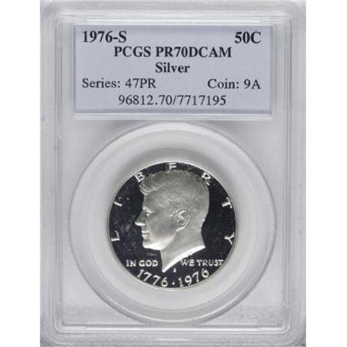 <B>1976-S 50C Silver PR70 Deep Cameo PCGS.</B></I> Despite the large mintages of proof sets with half dollars in either silver or clad formats, examples of the Bicentennial half dollar in the ultimate PR70 Deep Cameo grade are surprisingly sparse. As of (10/07), PCGS has certified only 26 silver specimens as PR70 Deep Cameo. The Bicentennial half dollars have exceptionally wide appeal that extends even to noncollectors, and this phenomenal piece boasts creamy silver-white mint frost over the black-mirrored fields. <BR><I>From The Kallenberg #1 PCGS Registry Set Of Proof Half Dollars.</B></I><BR><BR><b>Shipping:</b> Coins & Currency (<a target="_blank" href="http://www.heritageauctions.com/common/shipping.php">view shipping information</a>)