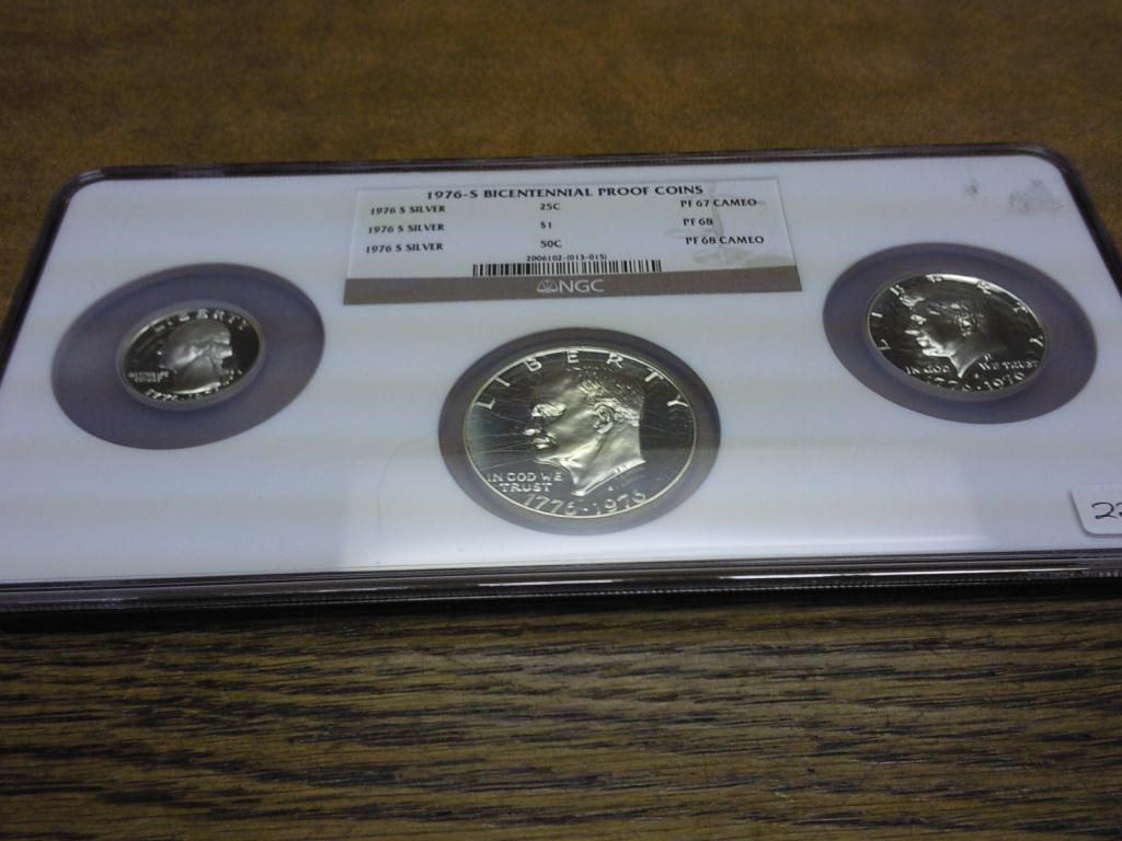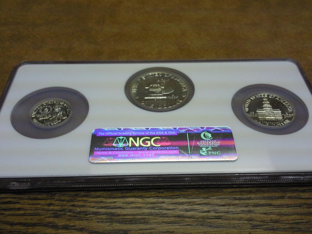MULTI COIN HOLDER, QUARTER IS PF67 CAMEO, HALF IS PF68 CAMEO AND DOLLAR PF68