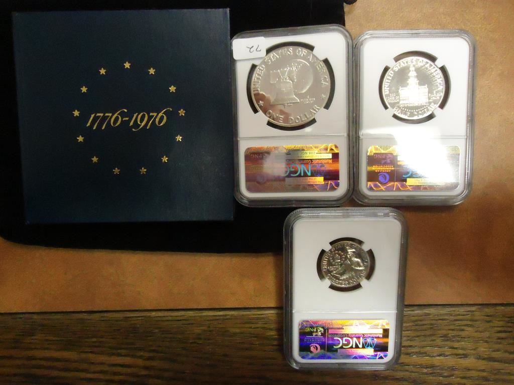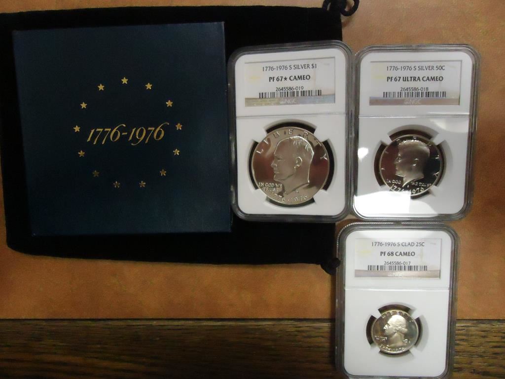 COINS ARE ALL NGC SLABS. QUARTER IS PF68 CAMEO, HALF IS PF67 ULTRA CAMEO AND DOLLAR IS PF67 STAR CAMEO, INCLUDES: ORIGINAL PACKAGING AND BLACK DRAW STRING BAG