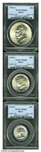 <B>1976-S Washington Quarter Silver MS68 PCGS,</B></I> fully struck untoned and pristine; <B>1976-S Kennedy Half Silver MS68 PCGS,</B></I> sharply struck with bright, matte-like, silver-white surfaces that are virtually flawless; and a <B>1976-S Eisenhower Dollar Silver MS68 PCGS,</B></I> unusually crisp details for the type, with flashy, highly lustrous, untoned surfaces that are near-pristine, save for a couple of faint grazes on the reverse.<BR><I>From The Western Hills Collection.</B></I>