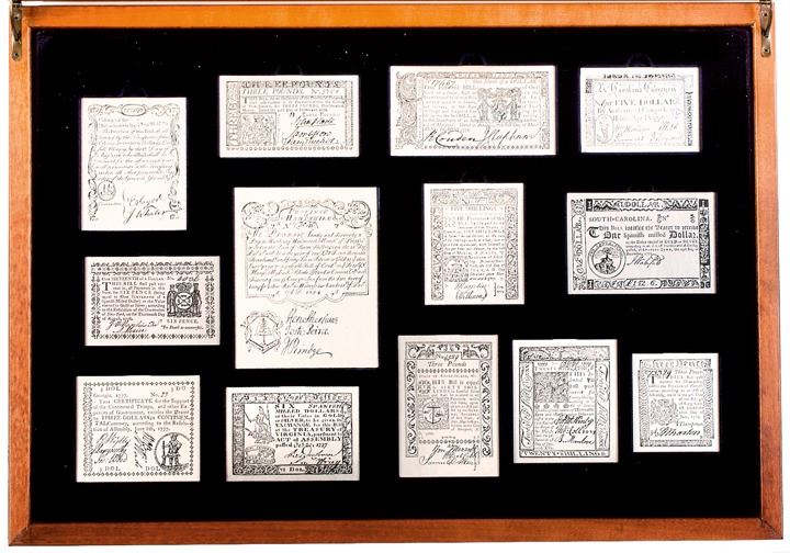 This historic, complete Colonial Currency Type Set was issued in celebration of America’s Bicentennial by the Franklin Mint in 1976. Modeled after actual existing notes and engraved in exceptionally qualified detail, this set includes a 1734 large size New Hampshire issue, among other various colonial emissions from the colonies of the period. Each note is placed in a felt lined display case with a plastic covering to protect the surface of each note, giving it a Proof type appearance. The professional wooden box display case has a plexiglass face on the cover, so as to most appropriately display the notes residing below. These sets have become nearly impossible to locate over the past few decades and we are very pleased to be able to offer one in such pristine original condition more than two decades after its original issue. The last time we offered one of these lovely sets was way back in 2003, and this is that very set, selling way back then for $998.