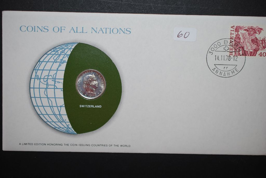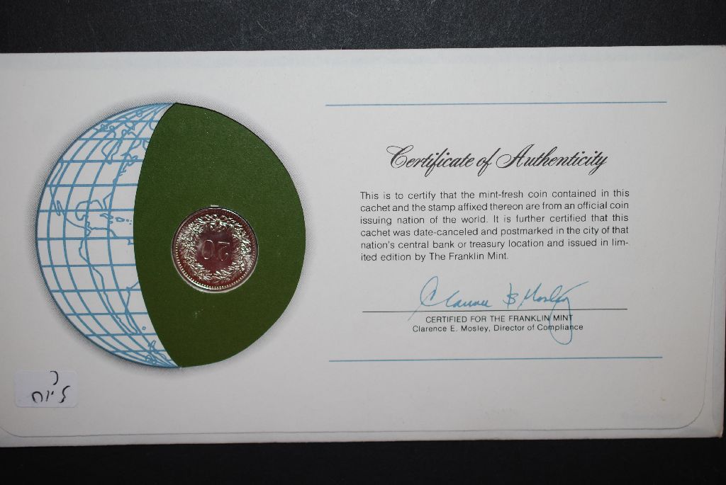 1976 Switzerland 20 Foreign Coin With COA Included; Coins Of All Nations With Postal Stamp Postmarked 1978; EST. $5-10