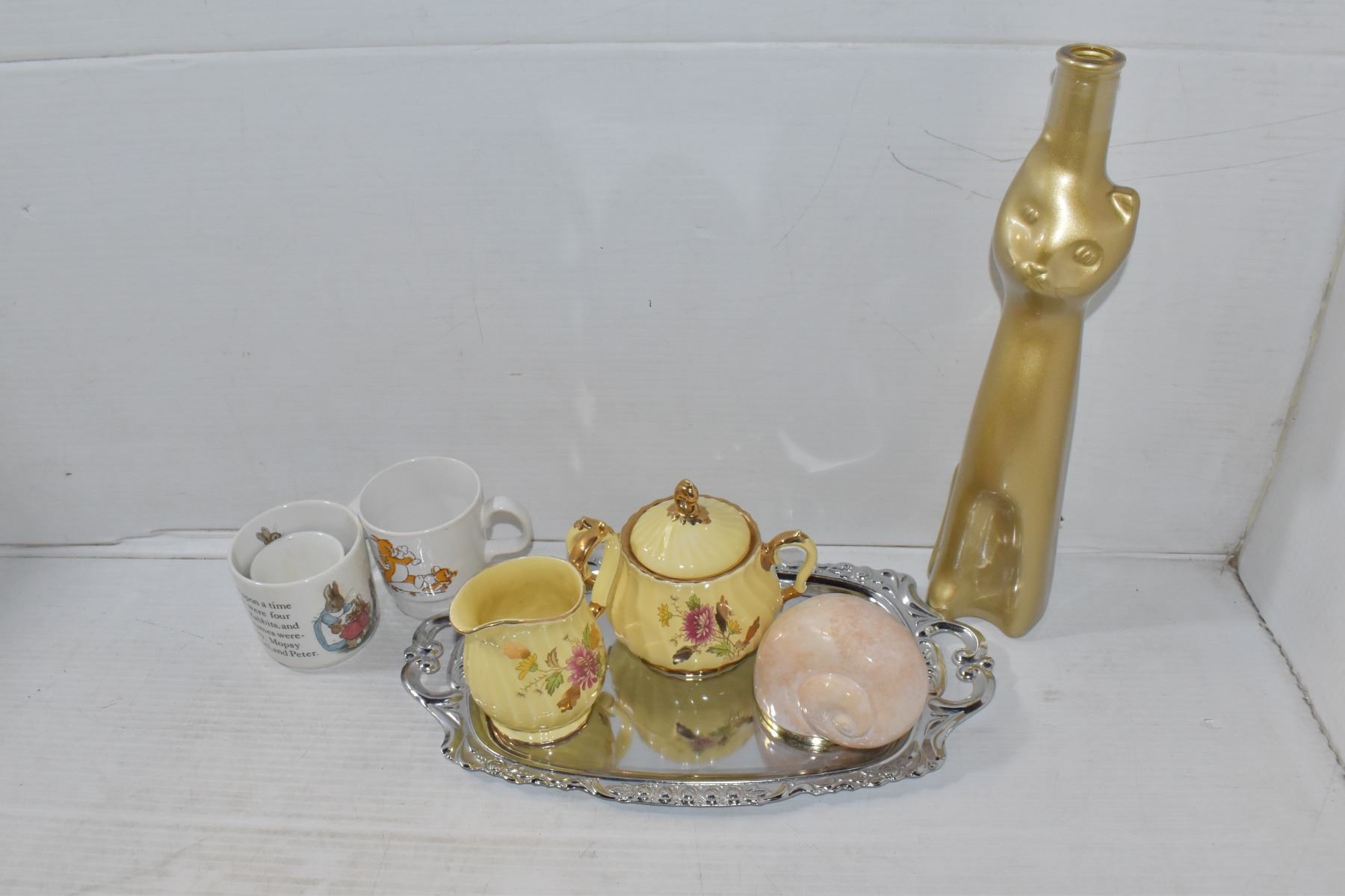 + ENGLAND + FRANCISICAN ENGLAND 5021 YELLOW COLOR TEA SET + VINTAGE THICK GREEN GLASS DISH AMBER WITH CLER SET WARE ,GOLD CAT BOTTLE VINTAGE CREAM AND SUGAR SET SADLER ENGLAND