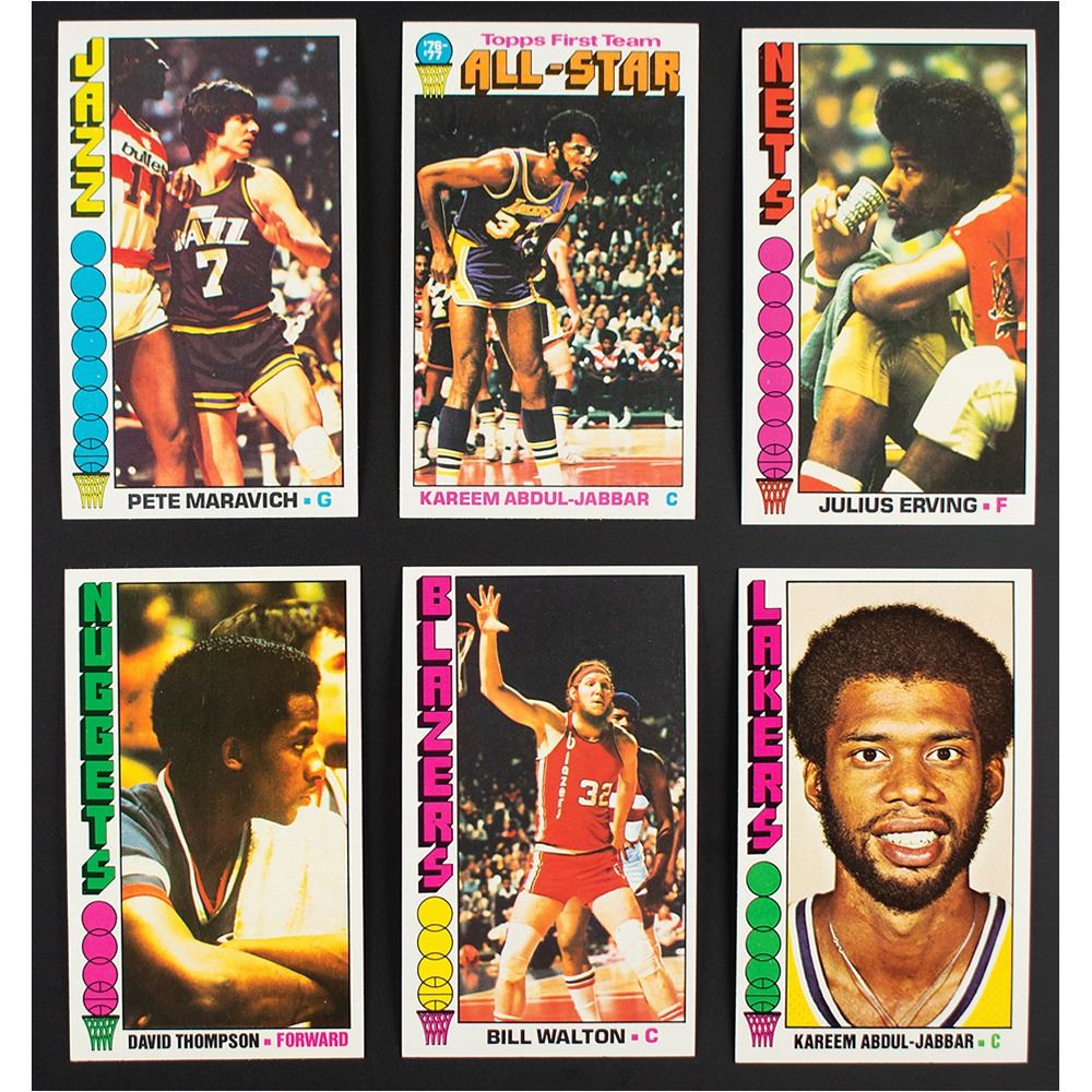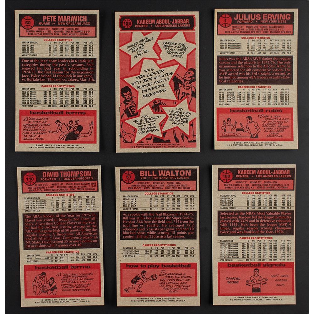 High-grade complete set (144/144) of 1976 Topps basketball cards, grading overall at 15% NM-MT, 70% NM, and 15% EX-MT due to centering. It is a fabulously consistent set with the overwhelming majority being near mint. Key cards include: #1 Julius Erving (NM), #57 Bill Walton (NM-MT), #60 Pete Maravich (NM+), #100 Kareem Abdul-Jabbar (EX-MT+), #110 David Thompson (NM), and #126 Kareem Adbul-Jabbar AS (NM+). An ideal set boasting vivid, full-color imagery in the classic Topps 'tallboy' format.