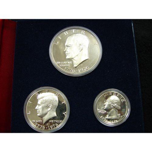 1976 U.S. BICENTENNIAL SILVER PROOF SET. Consists of three coins. In original folder and box.