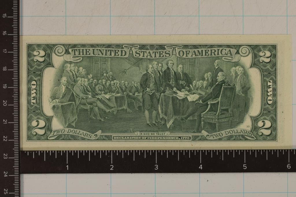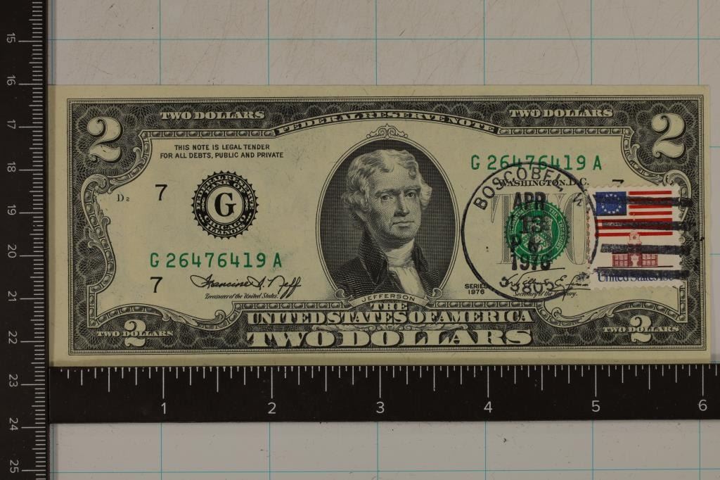 FROM THE 1ST DAY OF ISSUE FOR THE 1976 US $2 BILL BEING APRIL 13TH, 1976. MARGIN IS SLIGHLY LARGER ON THE LEFT SIDE AND THE PRINTING IS A SMIDGE OFF ALSO WHEN LOOKING AT IT FROM THE REVERSE. BOTH ARE MINOR.