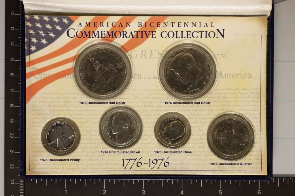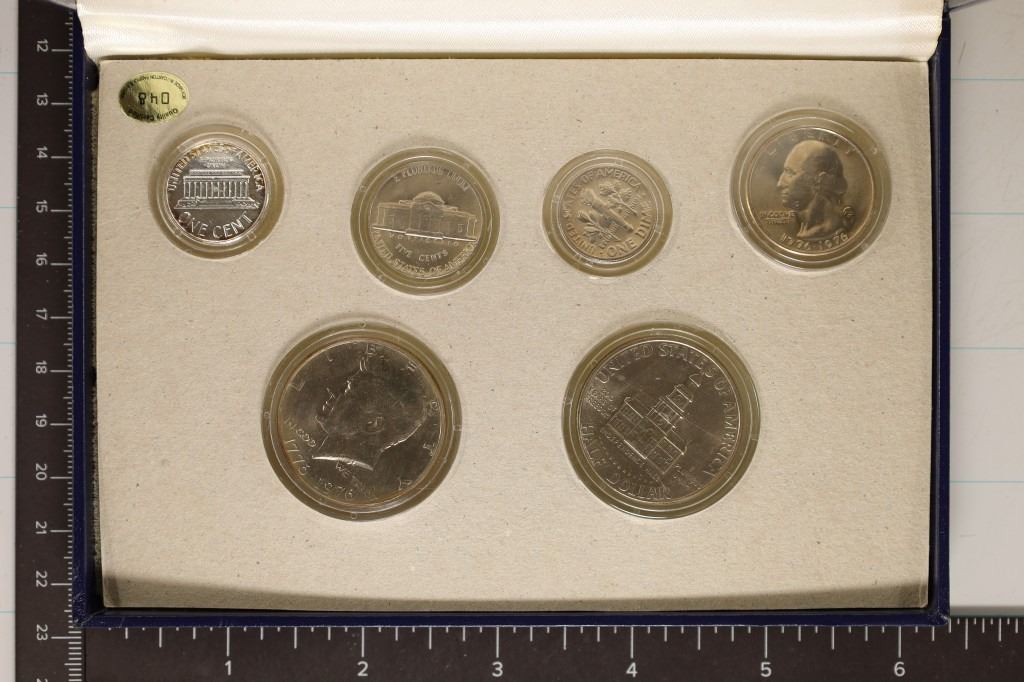 KENNEDY HALF DOLLARS, 1976 WASHINGTON QUARTER, 1976 JEFFERSON NICKEL, 1976 ROOSEVELT DIME AND 1976 LINCOLN CENT THAT HAS BEEN PLATED SILVER COLOR. IN CARDBOARD DISPLAY CARD IN BLUE CLAMSHELL BOX