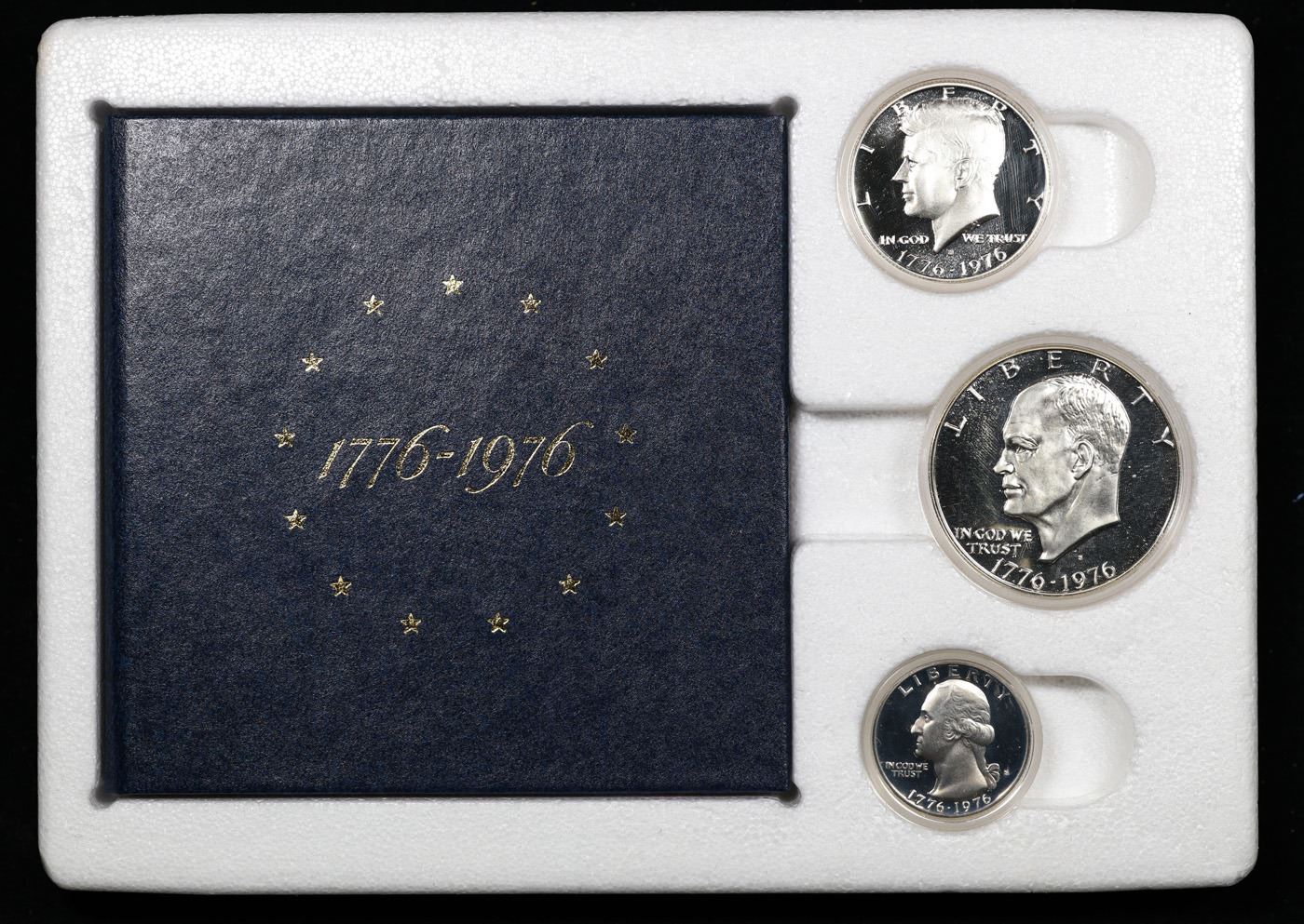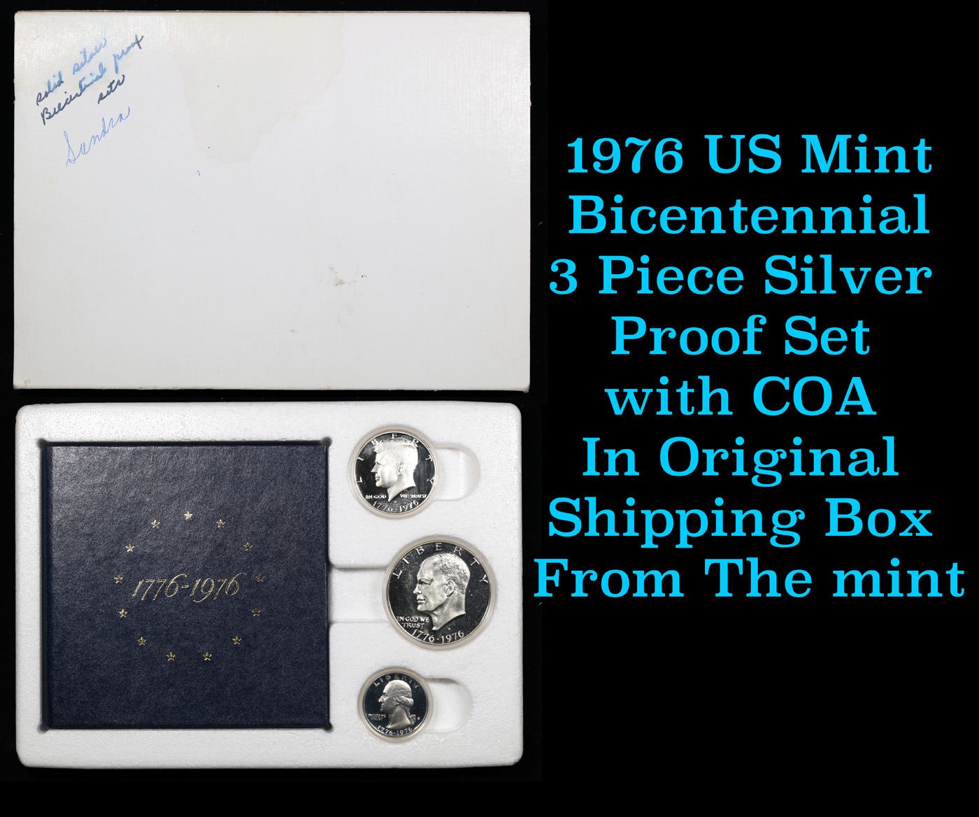1976 US Mint Bicentennial 3 Piece Silver Proof Set with COA In Original Shipping Box From The mInt. Minted to celebrate the Bicentennial, this special set includes the 40% Silver Uncirculated Ike Dollar, the 40% Silver Uncirculated Kennedy Half Dollar and the 40% Silver Uncirculated Washington Quarter