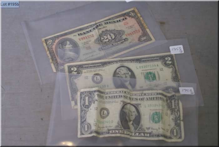 1976 US two dollar bill, 1963 US one dollar bill and a 1969 Mexican twenty peso note