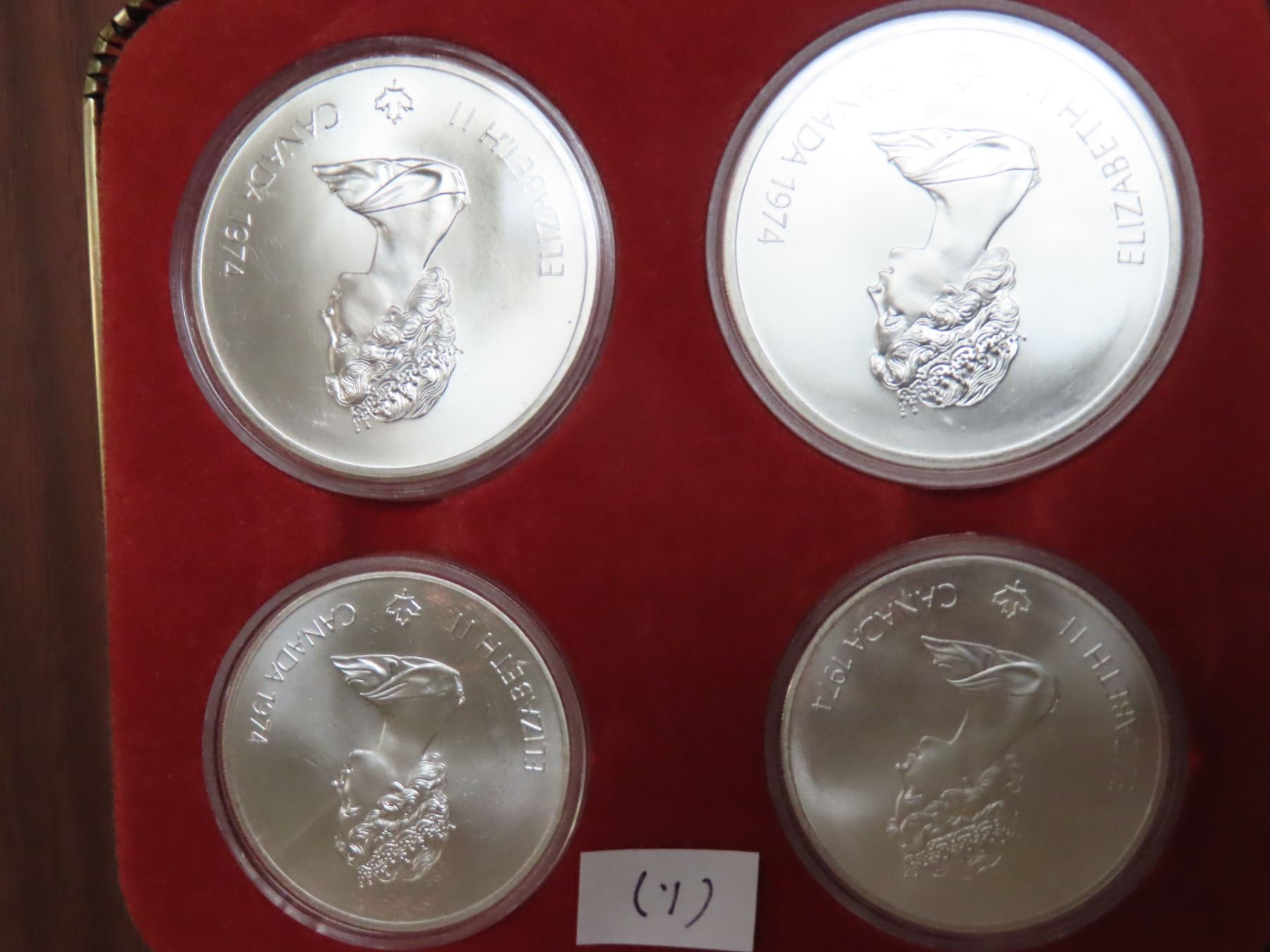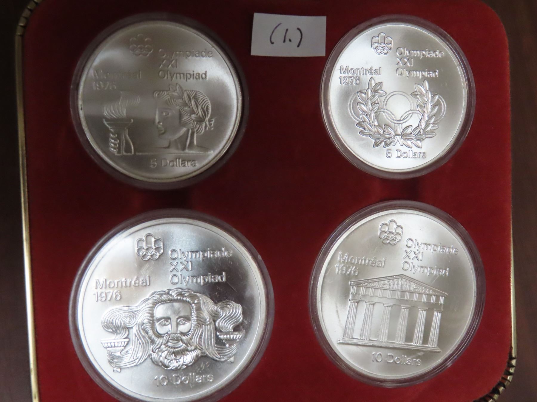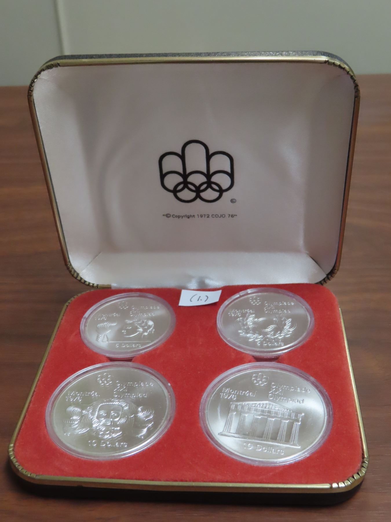 1976 montreal olympics sterling silver 4- coin set; $5 Athlete with torch and olympic rings ; $10 Zeus and temple of zeus