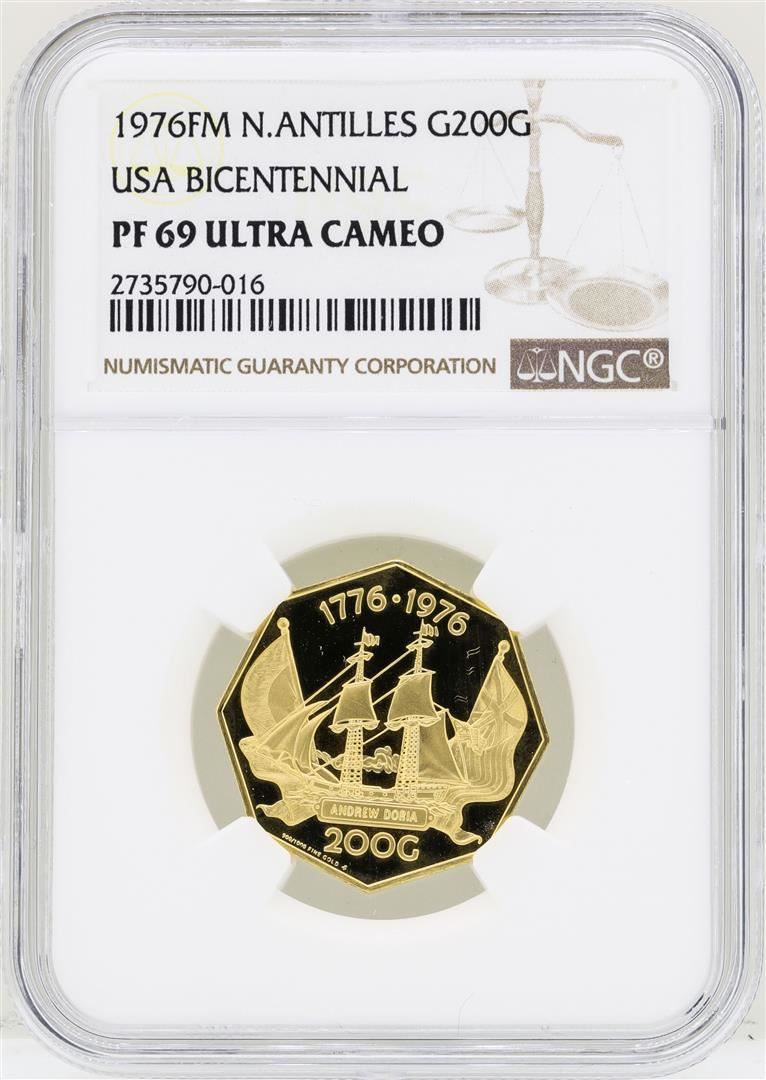 One 1976FM N.Antilles 200 Gulden USA Bicentennial Gold Coin NGC PF69 Ultra Cameo. NGC Certified.