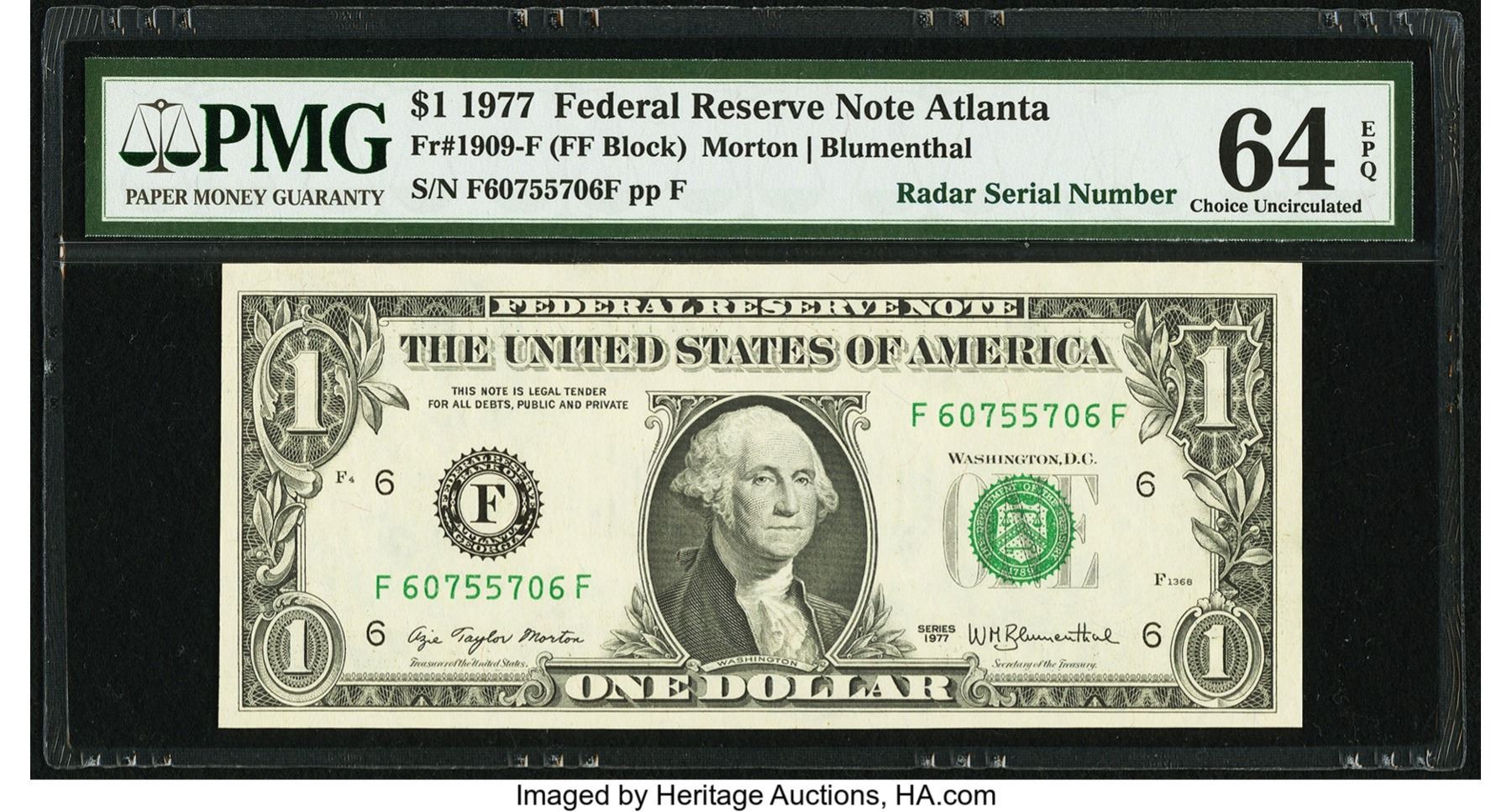 One 1977 $1 Atlanta Radar Serial Federal Reserve Note PMG 64EPQ.