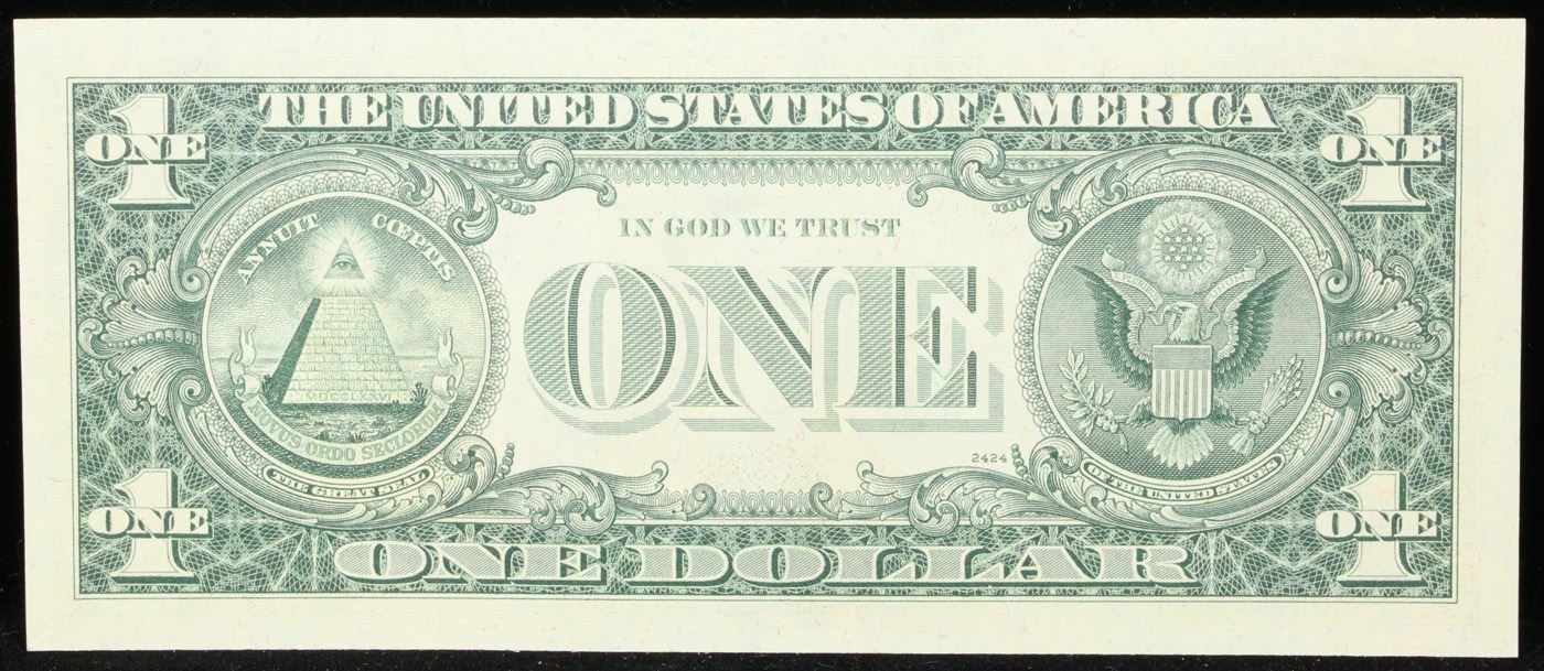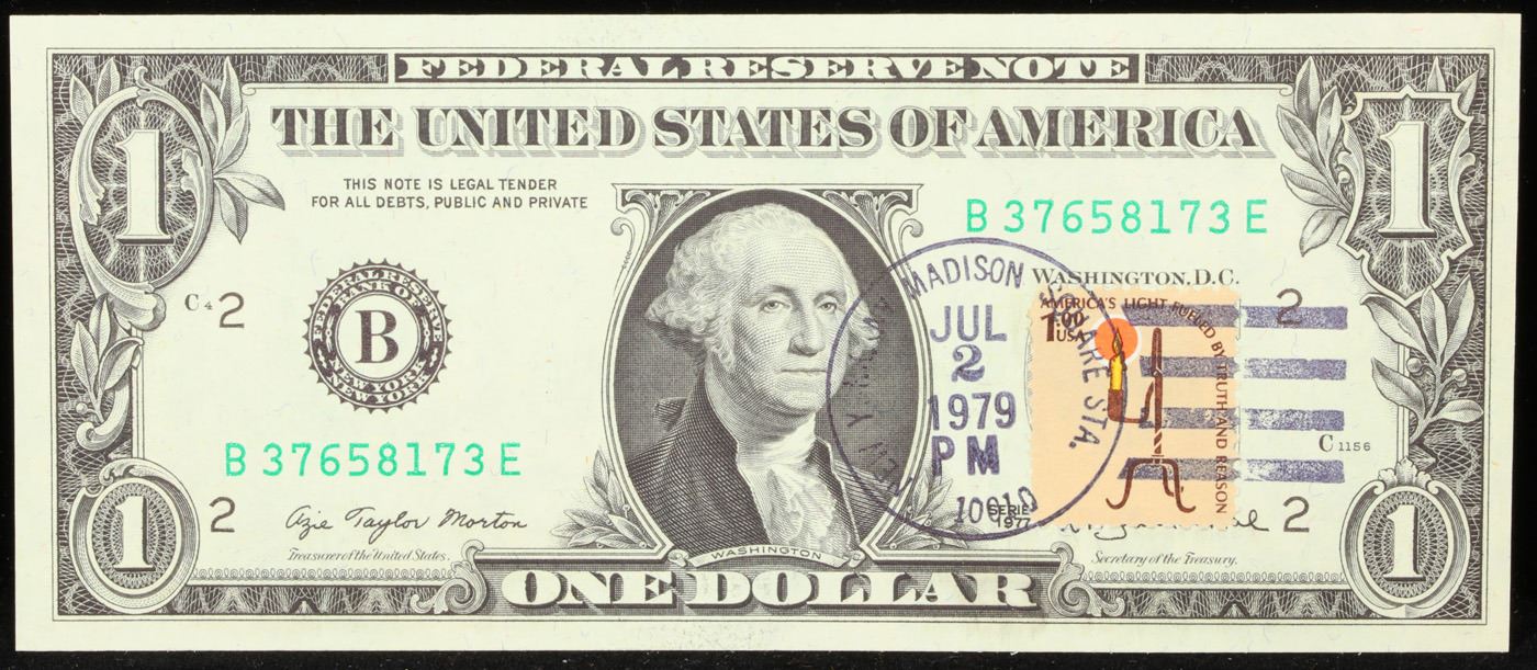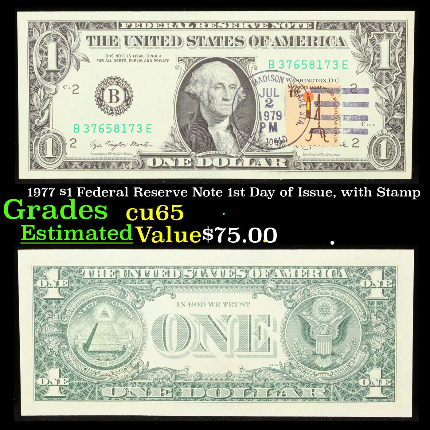 1977 $1 Federal Reserve Note 1st Day of Issue, with Stamp Grades Gem CU.
