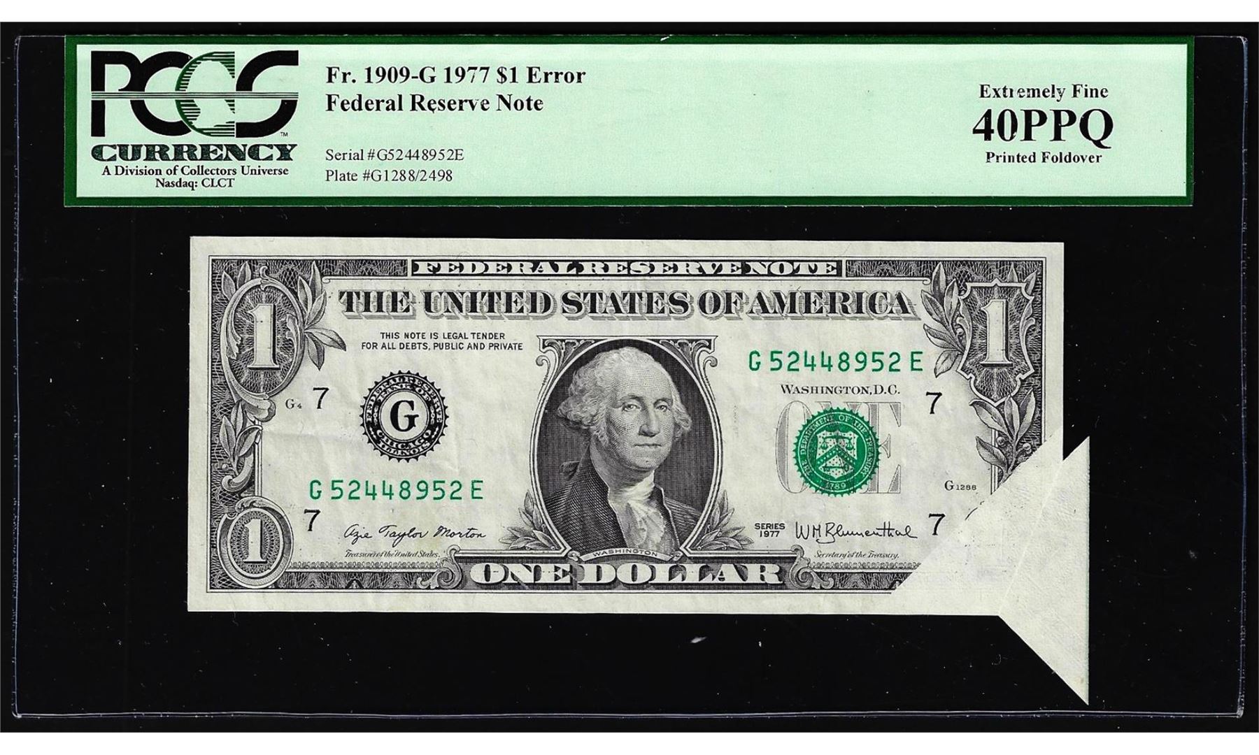 One 1977 $1 Federal Reserve Note Chicago Fold over Error PCGS Extremely Fine 40PPQ. PCGS Graded.