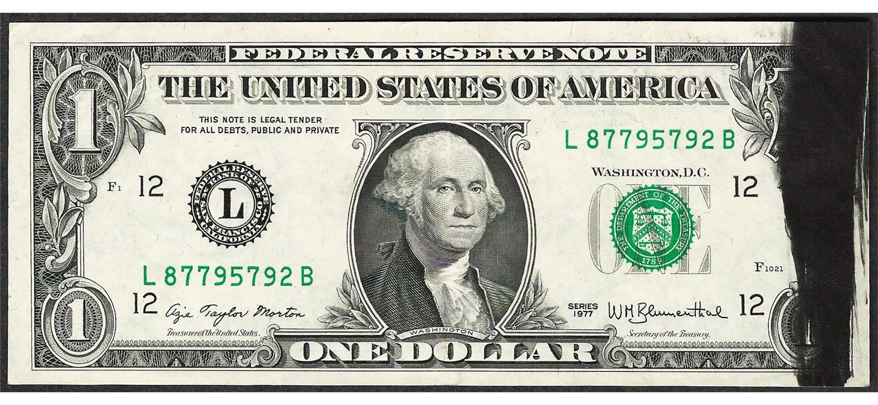 One 1977 $1 Federal Reserve Note ERROR Ink Smear.