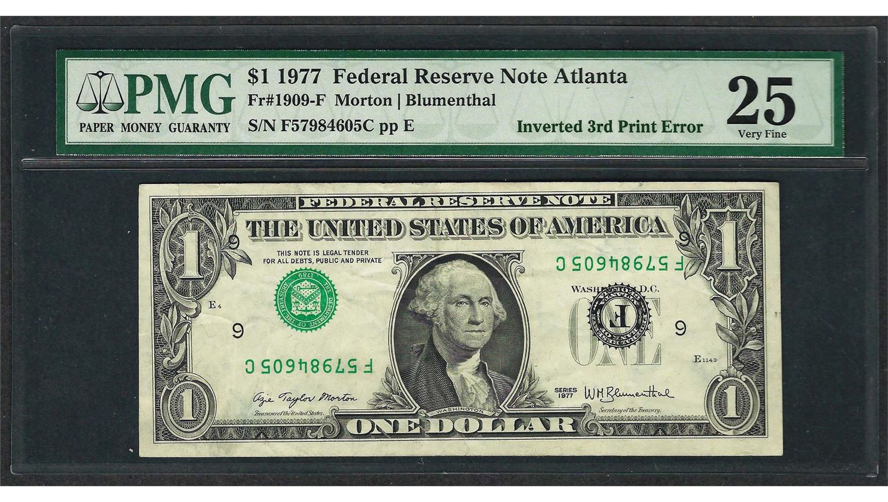 1977 $1 Federal Reserve Note ERROR Inverted 3rd Print PMG Very Fine 25