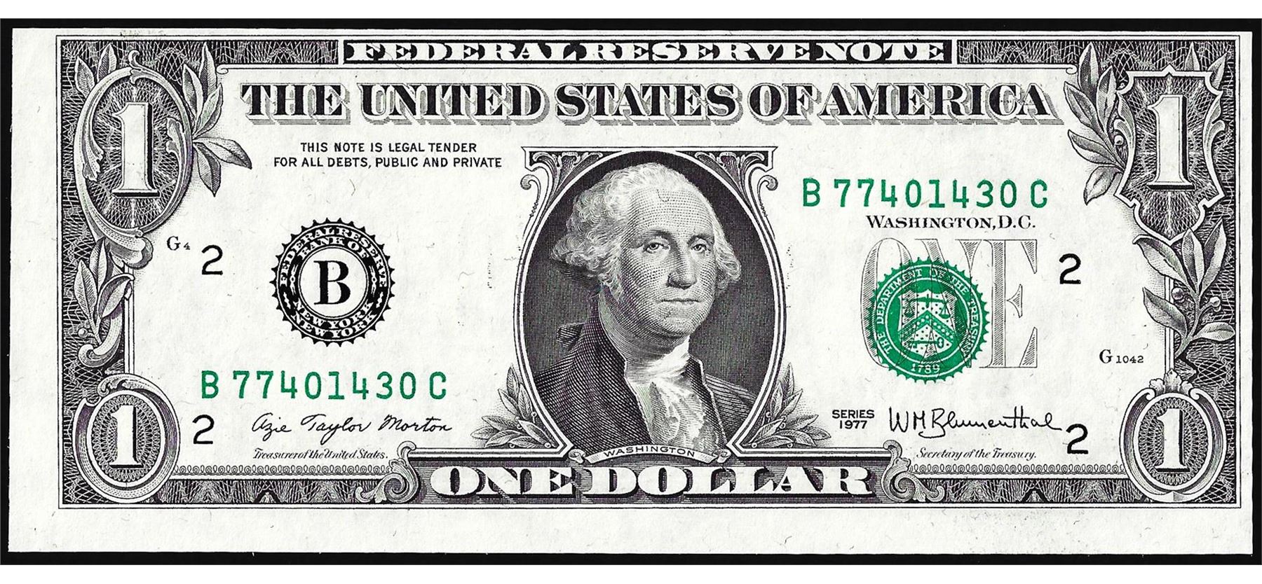 One 1977 $1 Federal Reserve Note Misaligned Printing Error.