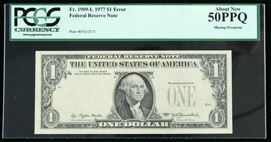 1977, $1 Federal Reserve Note. Missing Overprint. PCGS About New 50PPQ. . Fr-1909-L. The overprint is missing from this $1, although the embossing is fully evident indicating that the overprint was underinked.