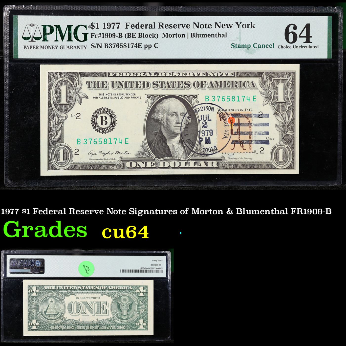 1977 $1 Federal Reserve Note Signatures of Morton & Blumenthal FR1909-B Grades Choice CU