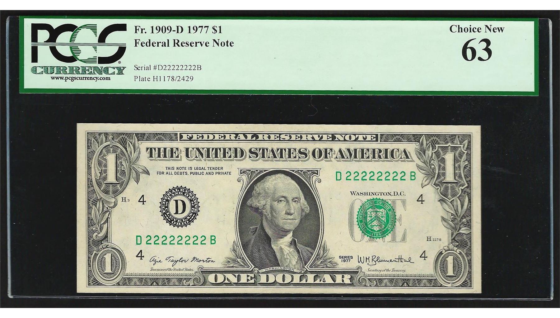 One 1977 $1 Federal Reserve Note Solid Serial Number PCGS Choice New 63. PCGS Graded.