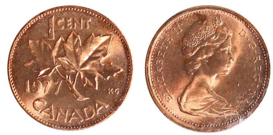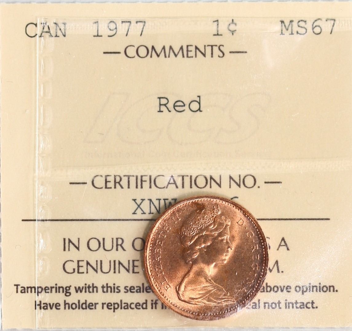 1977 1¢ ICCS Superb Gem Mint State-67RD. Blazing full 100% red and lustrous example.