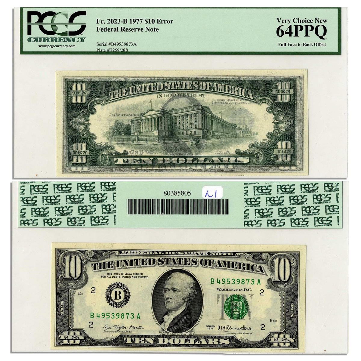 $10 Federal Reserve Error Note -- Series 1977, New York -- Graded PCGS 64PPQ -- Full Face to Back Offset