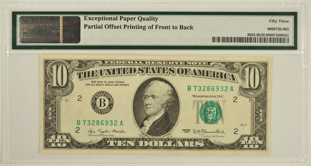 One 1977 $10 Offset Printing Error Federal Reserve Note PMG 53EPQ.