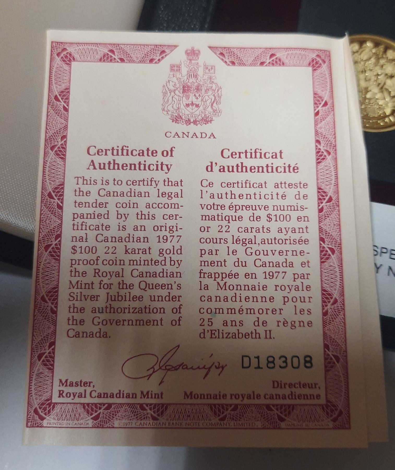 1977  $100.00, 22 Karat Gold Proof Coin. Certificate of Authenticity included.