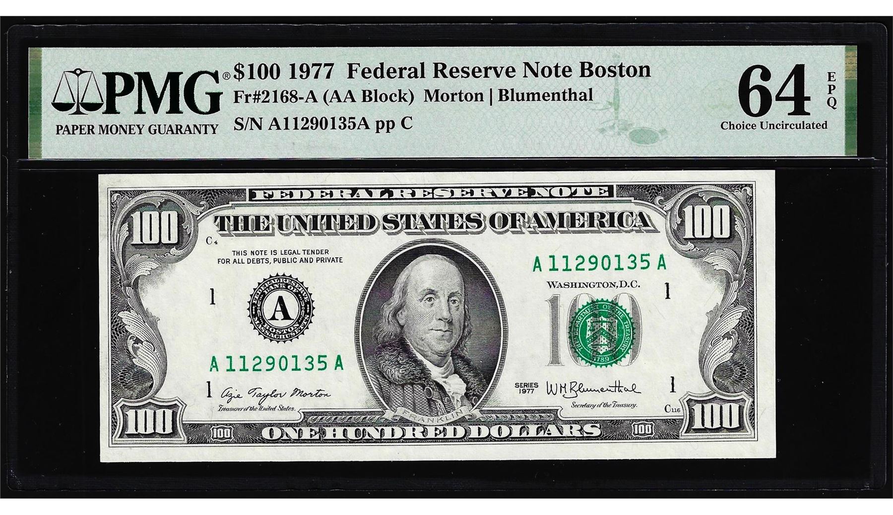 1977 $100 Federal Reserve Note Boston Fr.2168-A PMG Choice Uncirculated 64EPQ