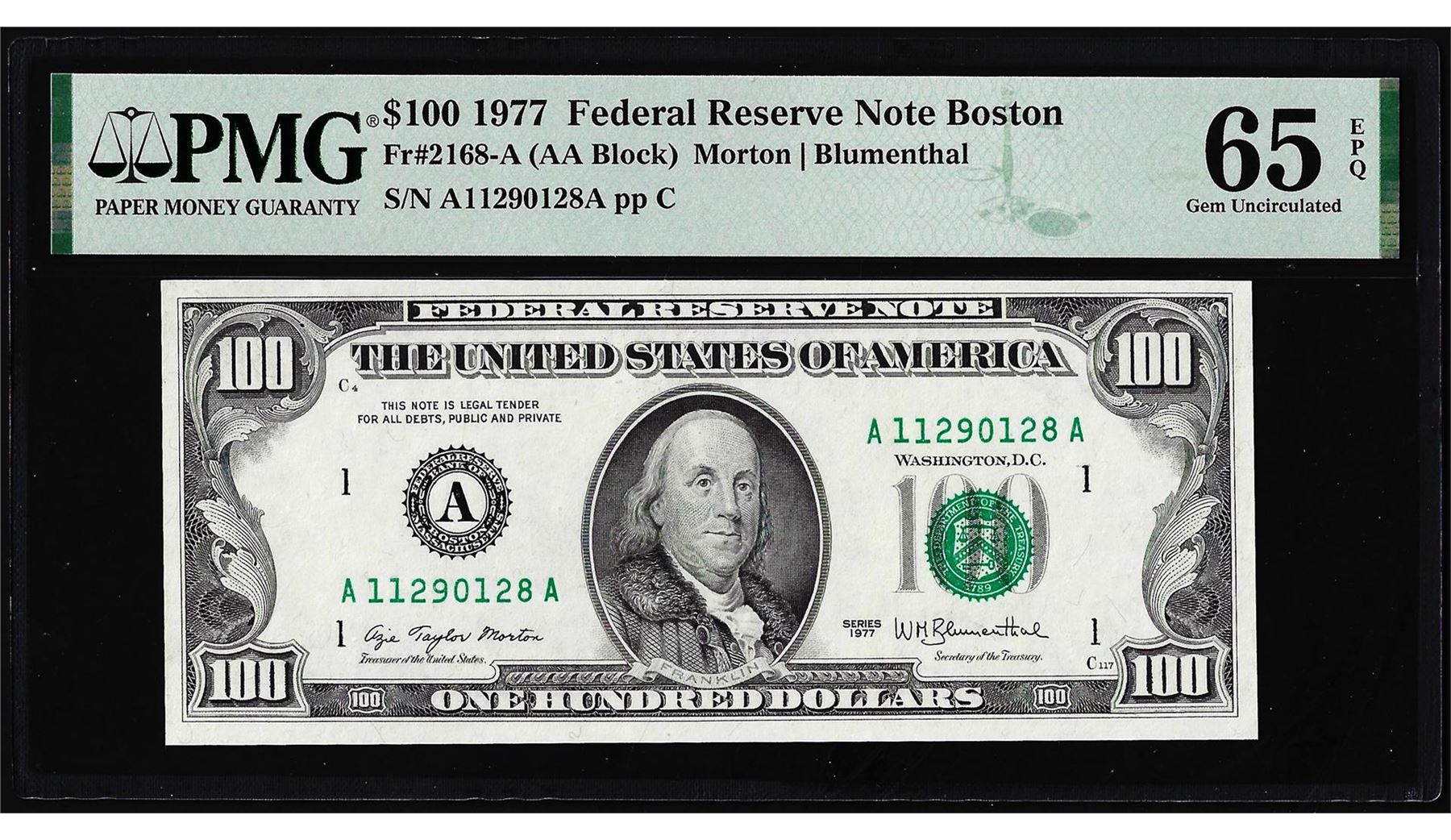 One 1977 $100 Federal Reserve Note Boston Fr.2168-A PMG Gem Uncirculated 65EPQ. PMG Certified.