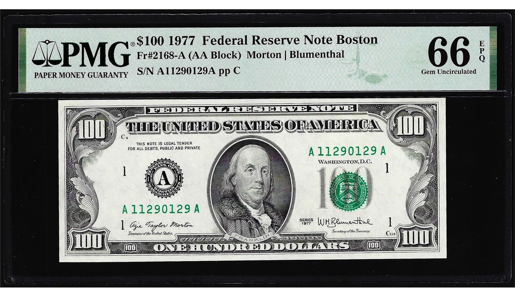 One 1977 $100 Federal Reserve Note Boston Fr.2168-A PMG Gem Uncirculated 66EPQ. PMG Certified.