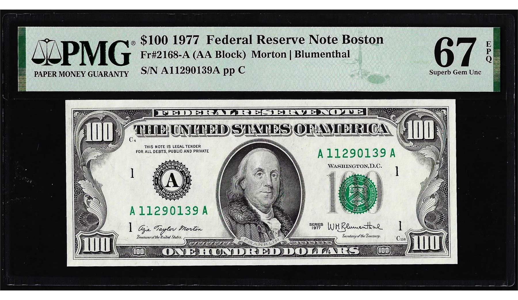 One 1977 $100 Federal Reserve Note Boston Fr.2168-A PMG Superb Gem Uncirculated 67EPQ. PMG Certified.