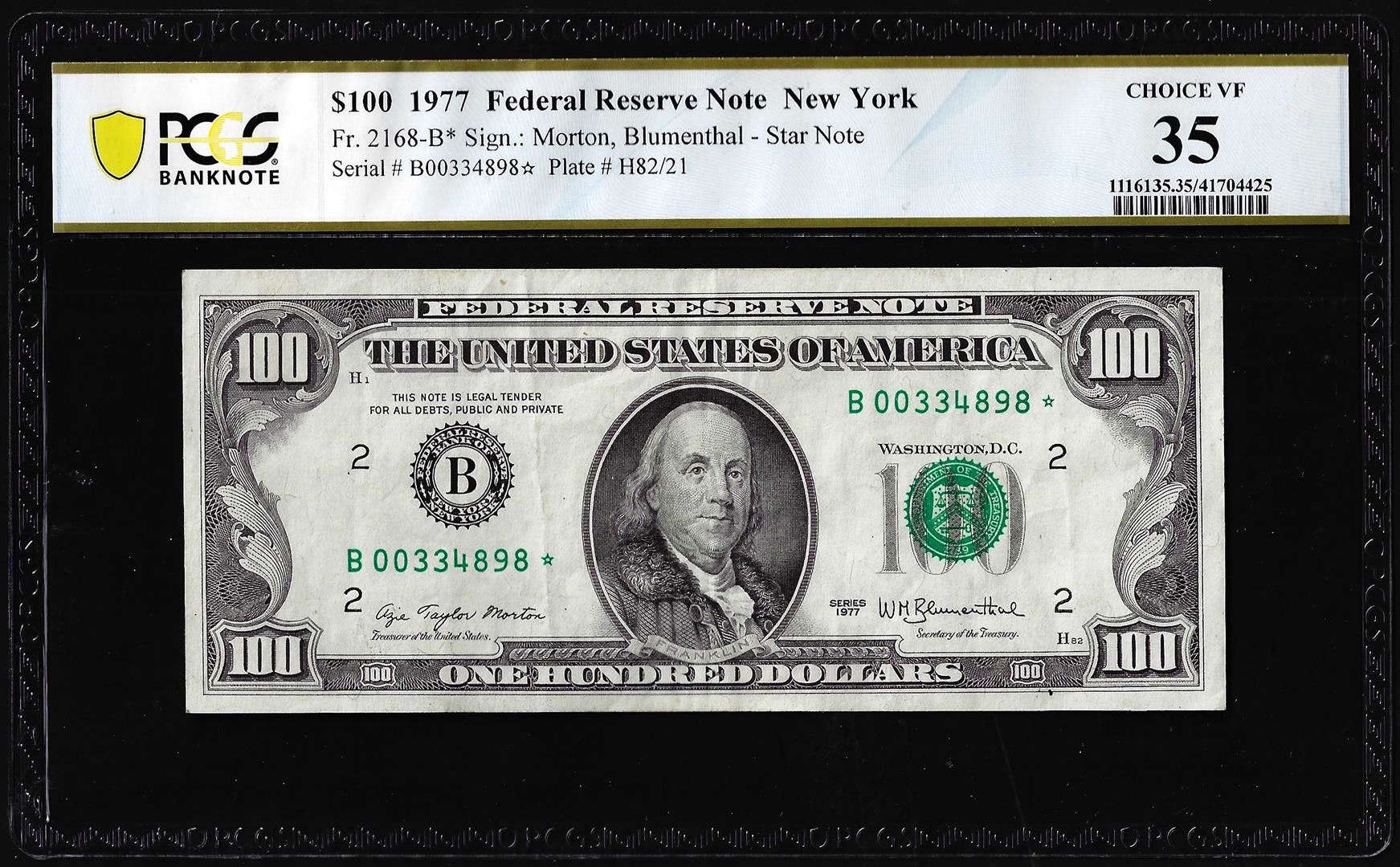 One 1977 $100 Federal Reserve Star Note New York Fr.2168-B* PCGS Choice VF35. PCGS Graded.
