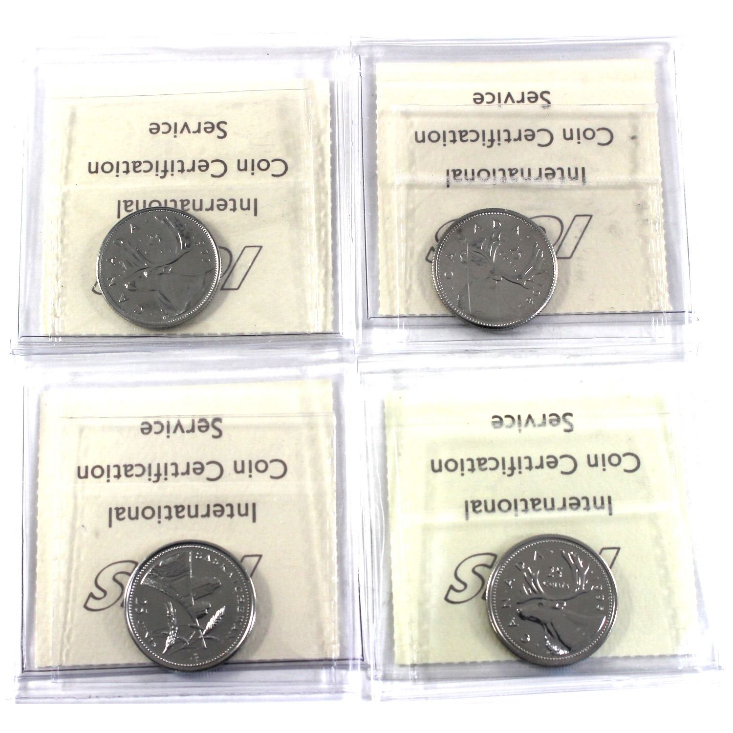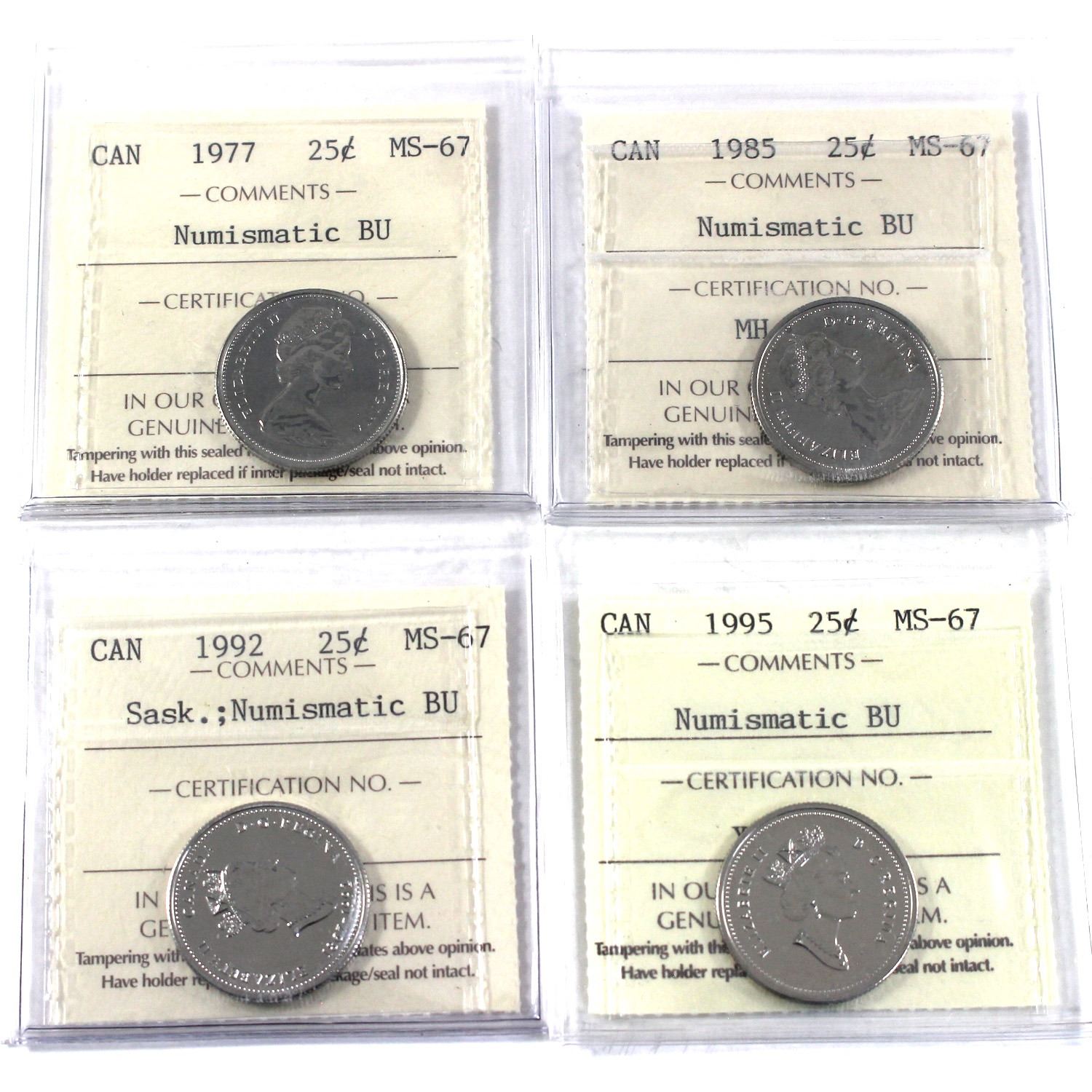 1977,1985,1992 & 1995 Canada 25-cent ICCS Certified MS-67 NBU. 4pcs