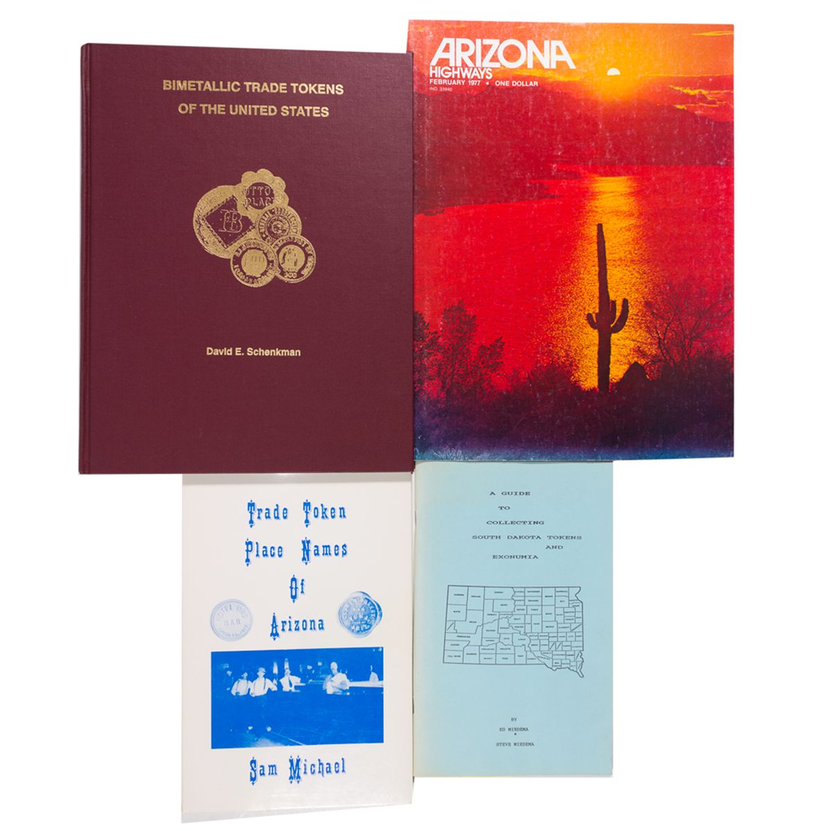 Lot of 4. 1) "Arizona Highways." Feb., 1977. Includes a section titled "Taken with Tokens" by Dan L. Thrapp (Arizona Token Collector). The section has a full sized 1:1 scale photograph of a large group of Arizona tokens, with additional photographs and reproductions of saloon interiors and more tokens (10 pp. in all to this section). Published by the Arizona Department of Transportation. 48 pp. 9" x 12". 2) Schenkman, David E." Bimetallic Trade Tokens of the United States." With valuations and an index of merchants by city and state. Jade House Publications, 1990. Hardbound in maroon cloth with gilt lettering. 163 pp. 8.5" x 11.5". 3) Michael, Sam. "Trade Token Place Names of Arizona." With photographic examples and accompanied descriptions. Map of Arizona place name locations at back. Soft cover/perfect bound with some separation at the spine. 118 pp. 6" x 9". 4) Miedema, Ed and Steve. "A Guide to Collecting South Dakota Tokens and Exonumia." No photos here but excellent descriptions of South Dakota tokens listed in alpha order by town and county. 1993. Soft cover/pamphlet bound. 28 pp. 5.5" x 8.5". - Vinegar Collection