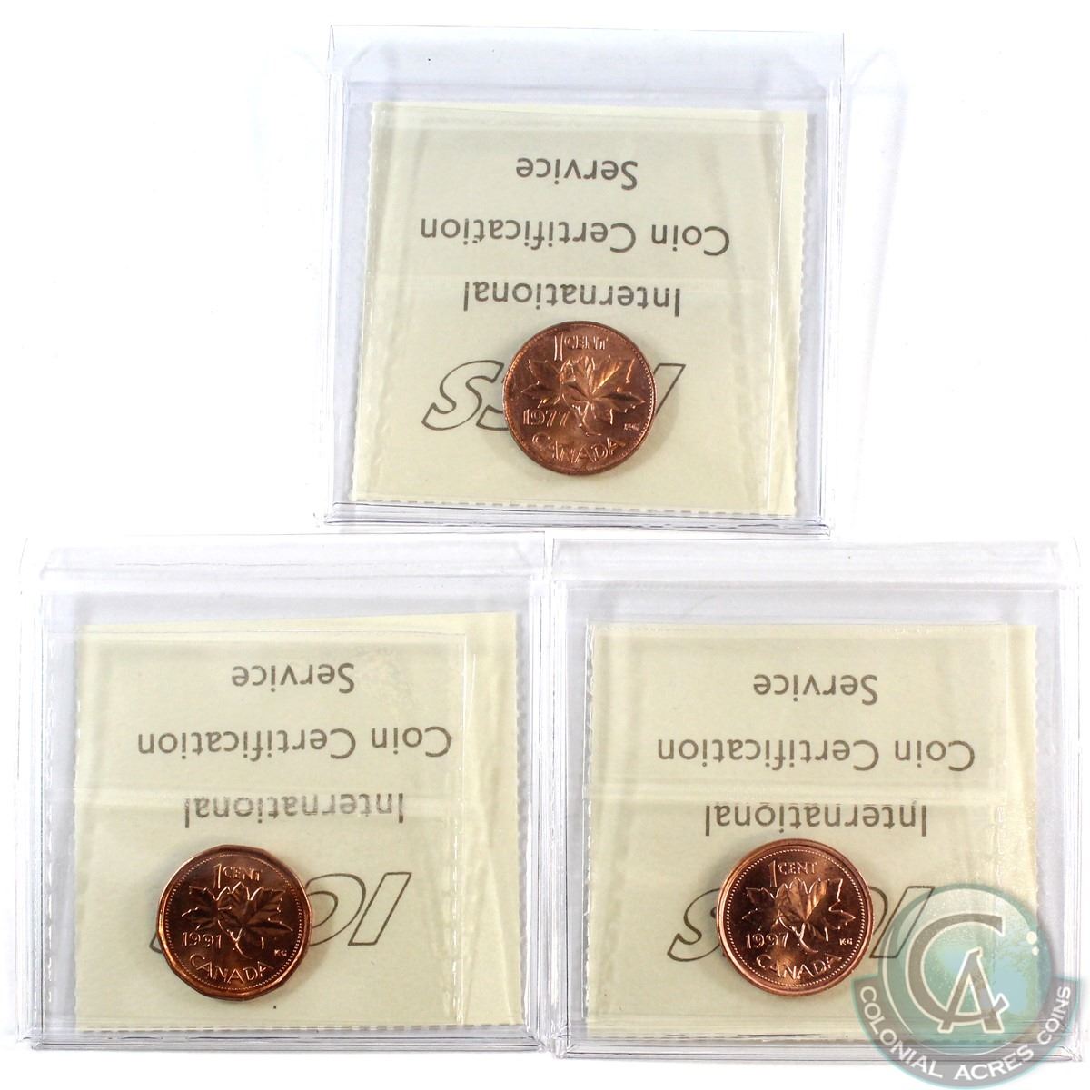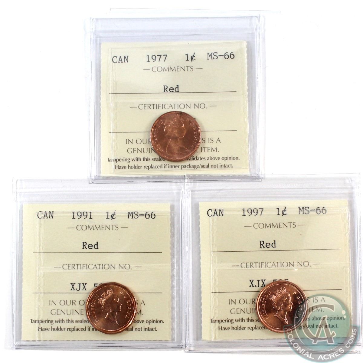 1977, 1991, 1997 Canada 1-cent ICCS Certified MS-66 Red. 3pcs.