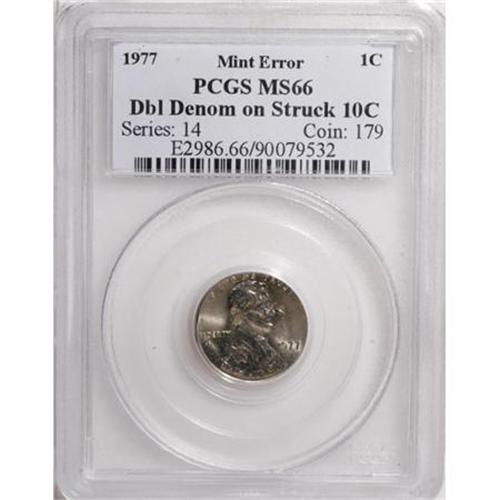 <B>1977 1C Error Cent--Double Denomination on Struck 1977 Dime--MS66 PCGS.</B></I> A lustrous silver-gray Gem with essentially pristine surfaces. Roosevelt's portrait is on the reverse of the cent, and is oriented approximately 190 degrees clockwise relative to the Cent reverse. Both dates are clear; the dime's date is located near STATES. An impressive mint error.<BR><BR><B>Coin Engraver:</B> Victor D. Brenner<BR><BR><b>Shipping:</b> Coins & Currency (<a target="_blank" href="http://www.heritageauctions.com/common/shipping.php">view shipping information</a>)