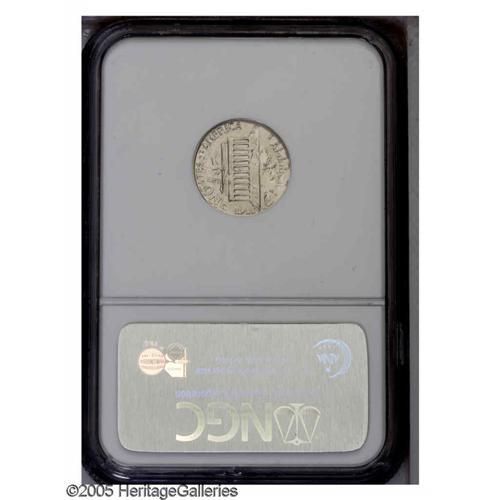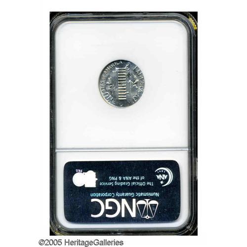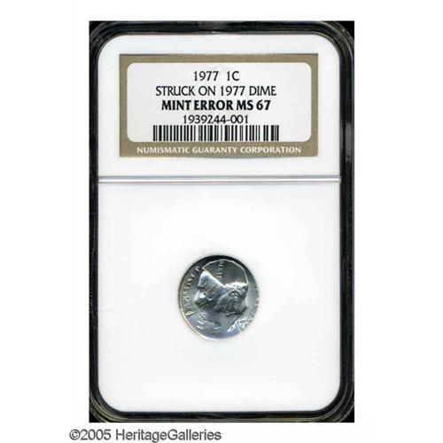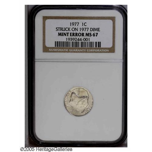 <B>1977<1C> Lincoln Cent--Struck on a 1977 Dime--MS67 NGC.</B></I> An impressive example of this desirable double denomination error. Roosevelt is face down relative to the bust of Lincoln. Roosevelt's head is virtually fully outlined, and the ears of the presidents are merged. Dates from both strikes are unmistakable, the Cent date near Roosevelt's chin, the Dime date is beneath TRUST. The Lincoln Memorial divides the sprigs from the prior Dime strike. Lustrous and essentially as made, aside from faint gold toning acquired over time.
