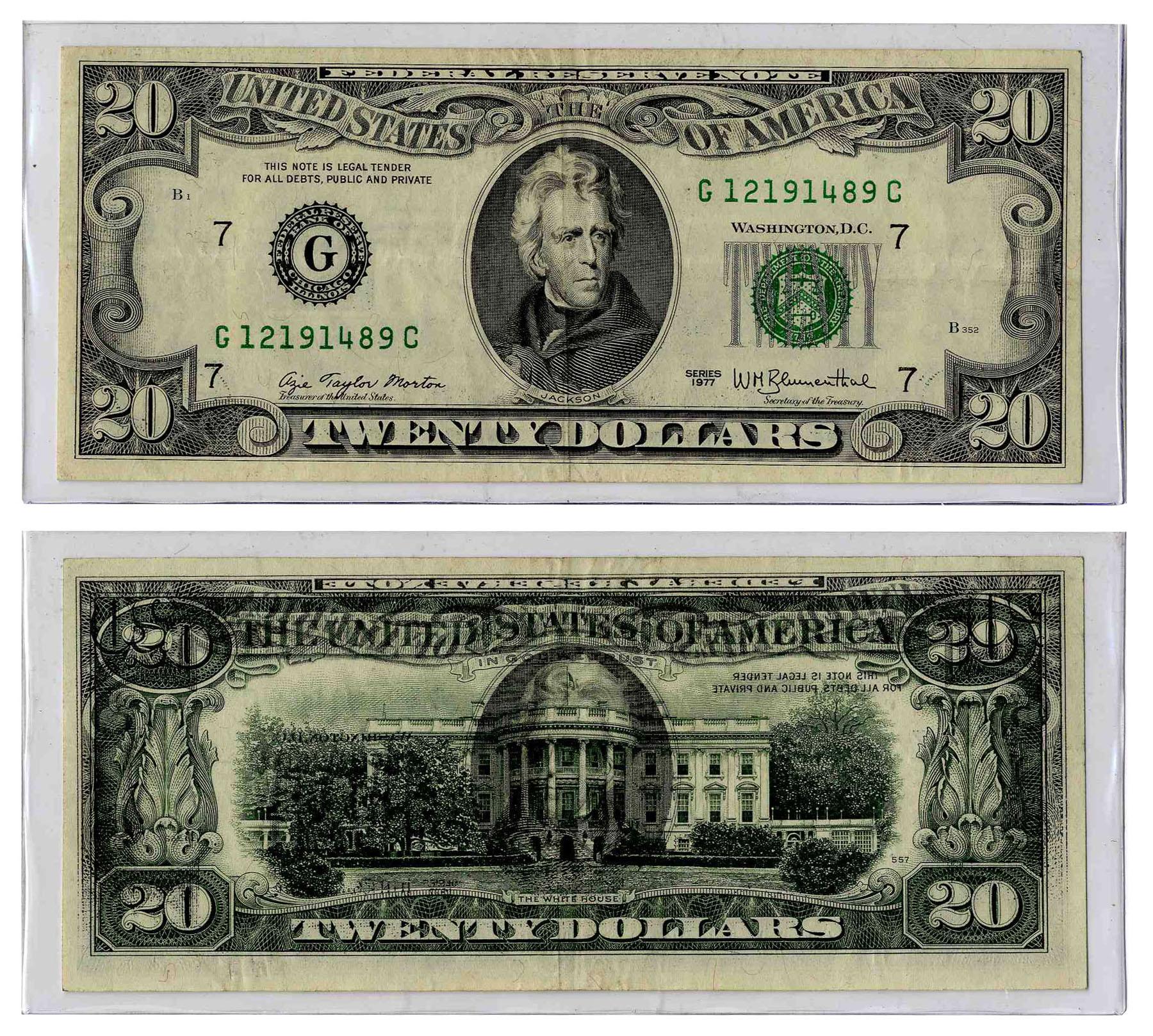 $20 Federal Reserve Error Note -- Series 1977, Chicago -- Full Face to Back Off-Set Printing Error -- Dark Ink to Verso