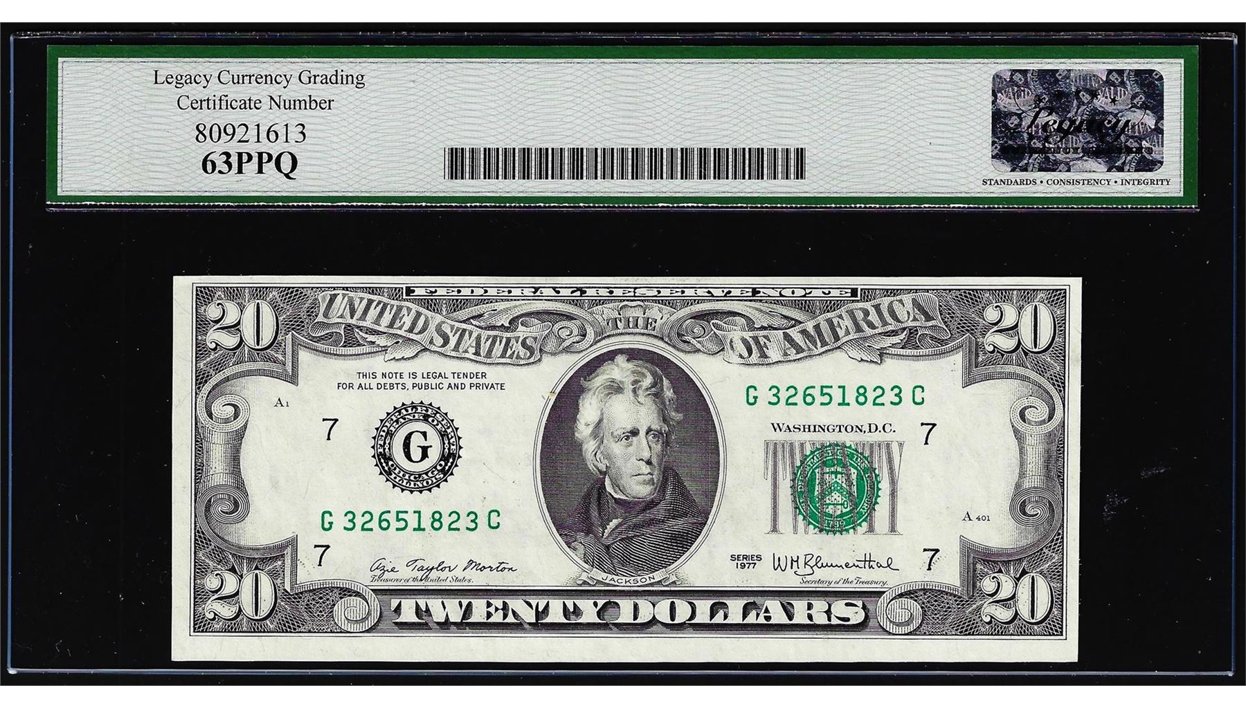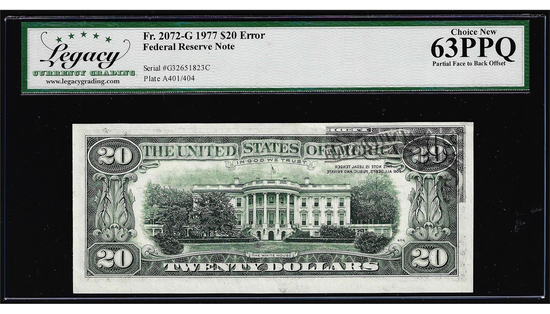 One 1977 $20 Federal Reserve Note Fr.2072-G Partial Offset Error Legacy Choice New 63PPQ. Legacy Graded.