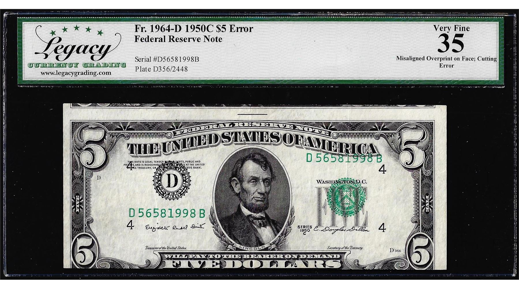 One 1977 $20 Federal Reserve Note Misaligned Overprint Cutting Error Legacy Very Fine 35. Legacy Graded.