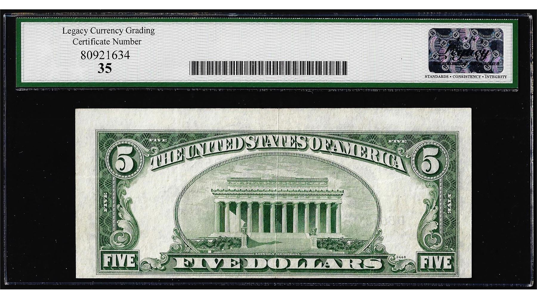 Any coins sold referencing a third-party grading service are sold AS IS without any express or implied warranty. Notes sold referencing a third-party grading service are sold AS IS without any express or implied warranty. Grading, condition or other attributes of any lot may have a material effect on its value, and the opinion of others, including third-party grading services may differ with that of BKA. BKA shall not be bound by any prior or subsequent opinion, determination, or certification by any grading service. Bidder specifically waives any claim to right of return of any item because of the opinion, determination, or certification, or lack thereof, by any grading services. Third-party graded notes are not returnable for any reason whatsoever.