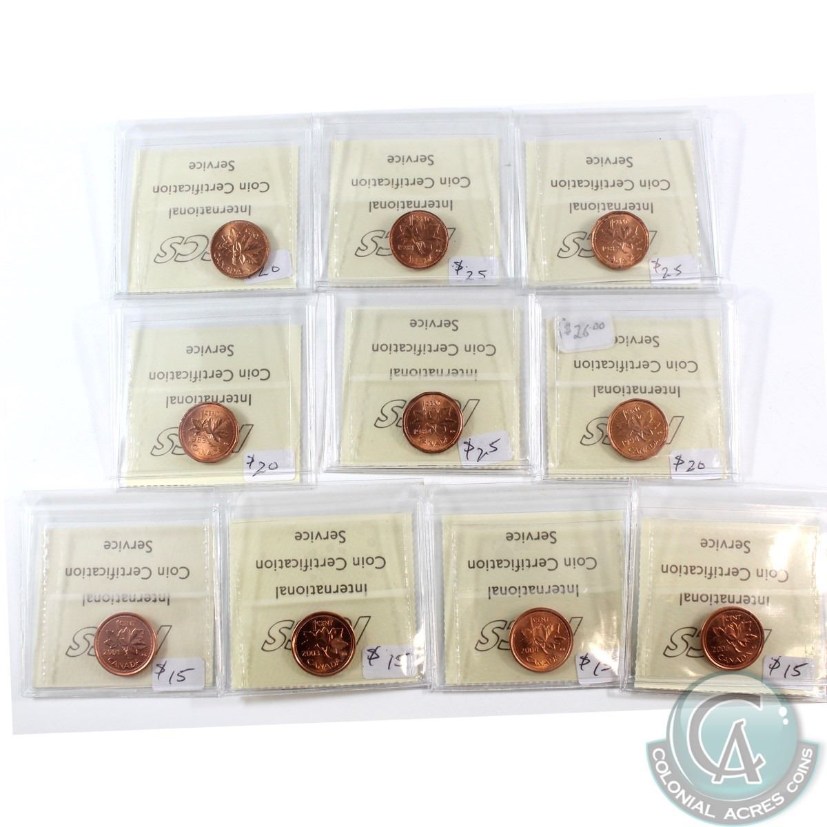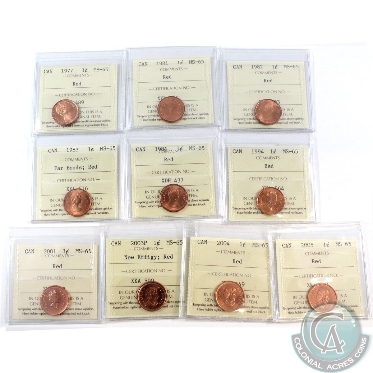 1977-2005 Canada 1-cent ICCS Certified MS-65 Red Collection. You will receive 1977, 1981, 1982, 1983 Far Beads, 1984, 1994, 2001, 2003P New Effigy, 2004, 2005. 10pcs.