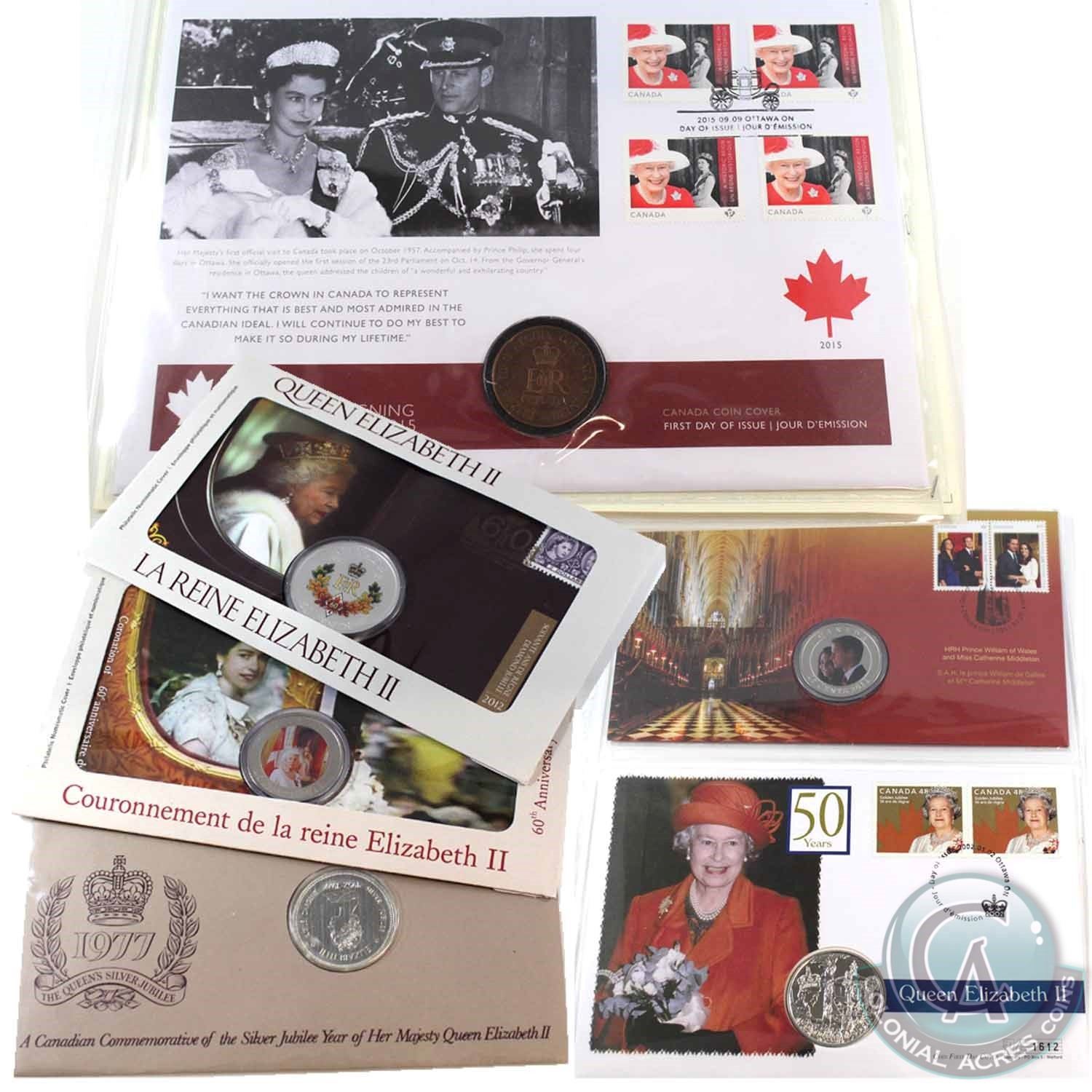 1977-2015 Canada Queen Elizabeth II/Royal Coin and Stamp Collection. You will receive a 1977 Silver Dollar & Stamp set, 2002 Silver Dollar & Stamp set, 2011 Will and Kate 50-cent Coin & Stamp set, 2012 50-cent Coin & Stamp Set, 2013 25-cent Coin & Stamp Set, and 2015 Medallion & Stamp Set. 6 sets.