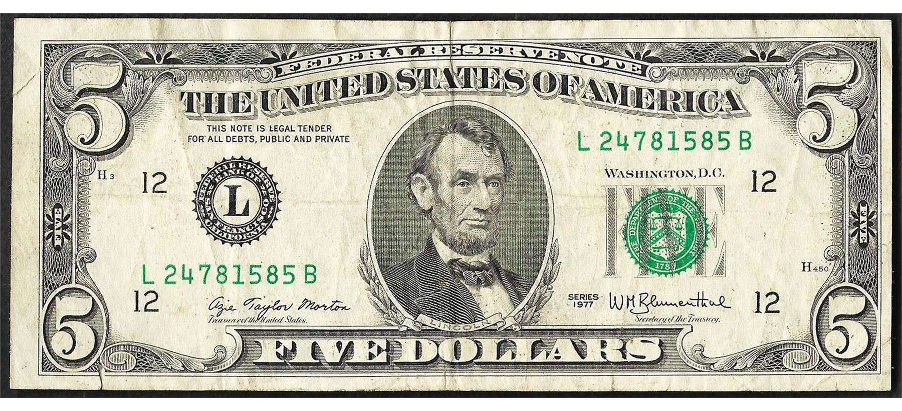 One 1977 $5 Federal Reserve Note Full Offset ERROR.