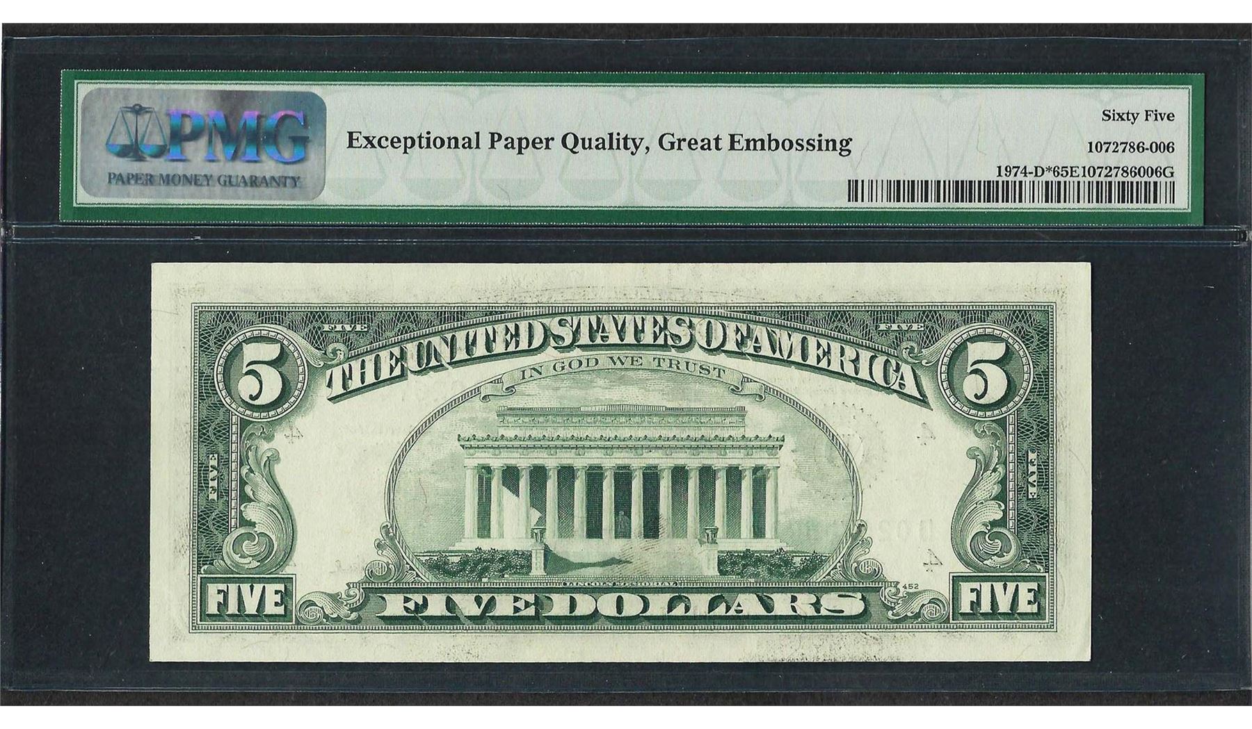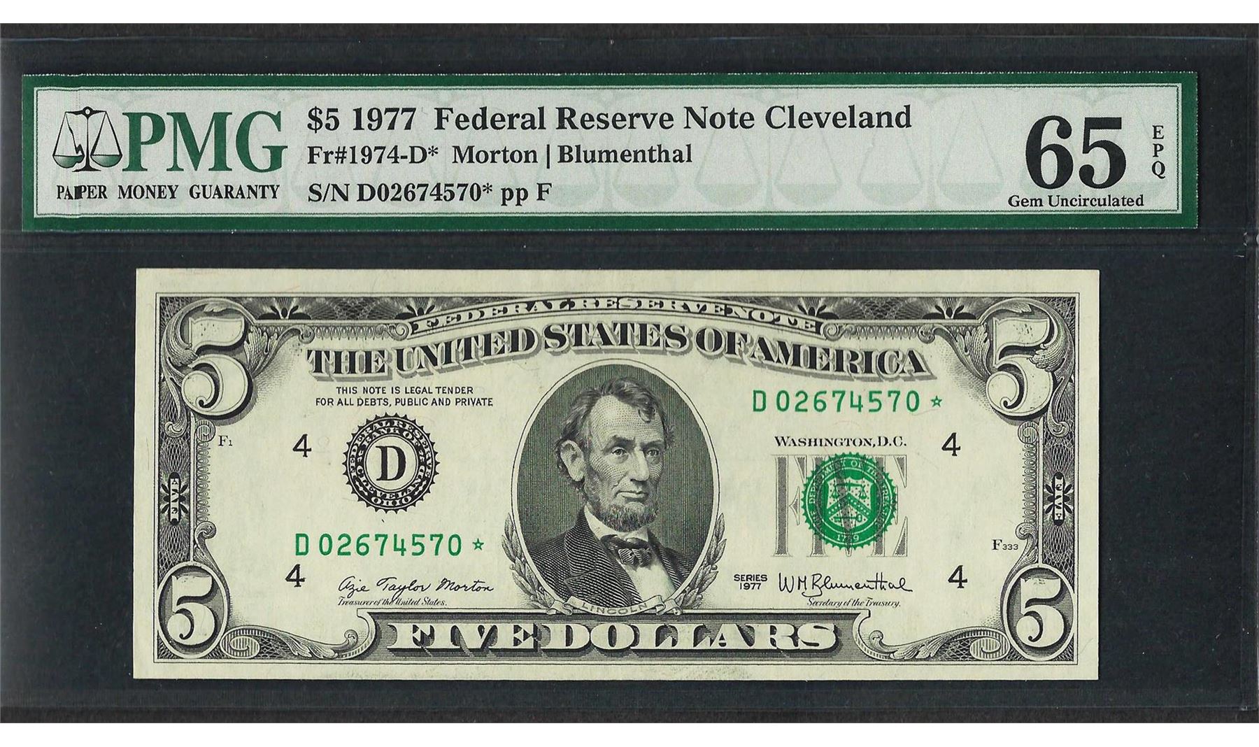 One 1977 $5 Federal Reserve STAR Note Fr.1974-D* PMG Gem Uncirculated 65EPQ. PMG Certified.