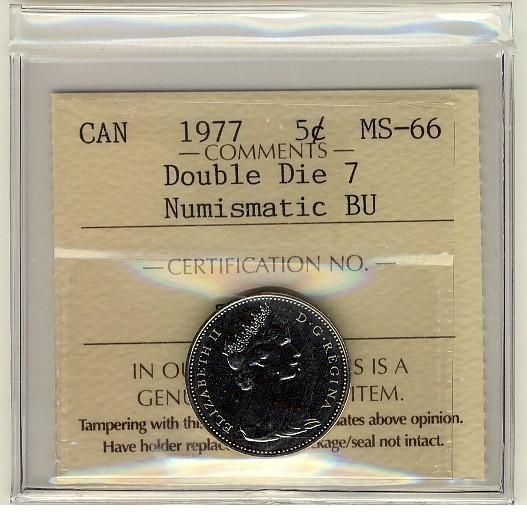 1977 5¢ ICCS MS66 Double Die 7 Numismatic BU interesting variety.
