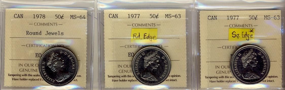 1977 50¢ (2) MS63 & 1978 Round Jewels 50¢ MS64. Lot of 3 coins. Both 1977 show Square and Round edge varities. All ICCS graded