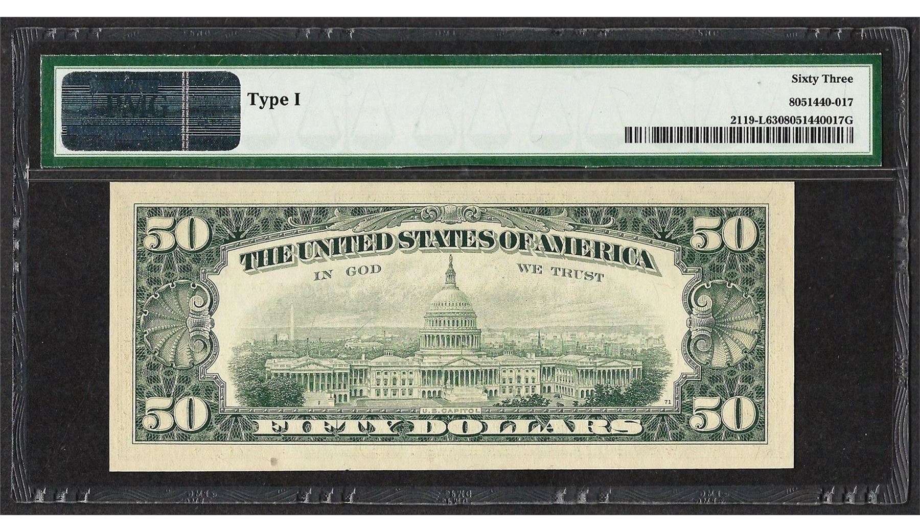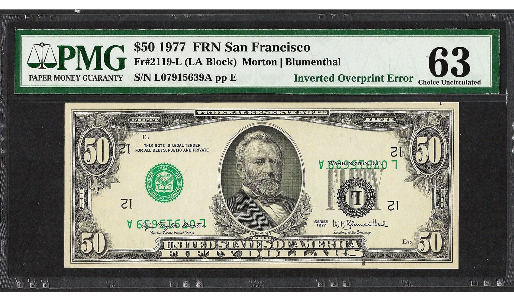 One 1977 $50 Federal Reserve Note ERROR Inverted Overprint PMG Choice Uncirculated 63.